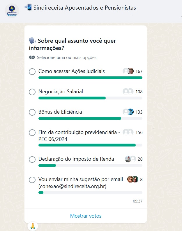 Esta é primeira enquete realizada pelo Sindireceita junto aos filiados e filiadas, com utilização da plataforma WhatsApp. A ação inédita contou com participação expressiva de colegas em todo o Brasil, que foram convidados a responder a seguinte pergunta: “Sobre qual assunto você quer informações?”. A enquete teve início na quarta-feira, dia 26, e foi encerrada nesta sexta-feira, dia 28. Mais de 260 filiados aposentados(as) e pensionistas participaram da enquete, selecionando uma ou mais opções entre as seis disponíveis para votação (confira o resultado abaixo).