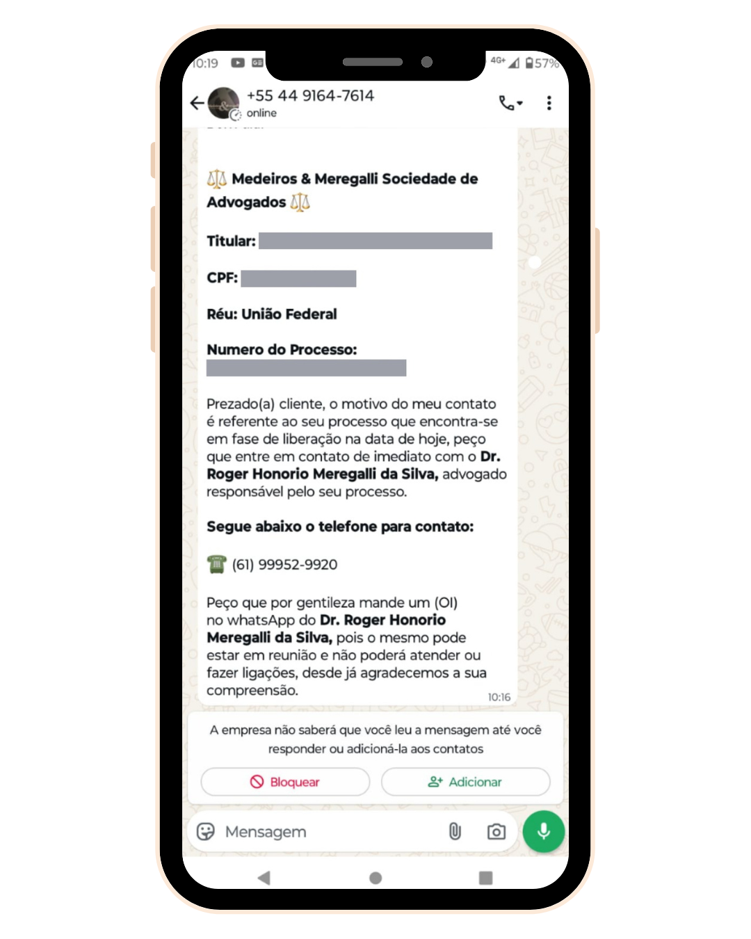Embora o nome do advogado e número da ação sejam os corretos, estão usando criminosamente o nome e dados do escritório, do advogado e da ação para obterem vantagens indevidas.