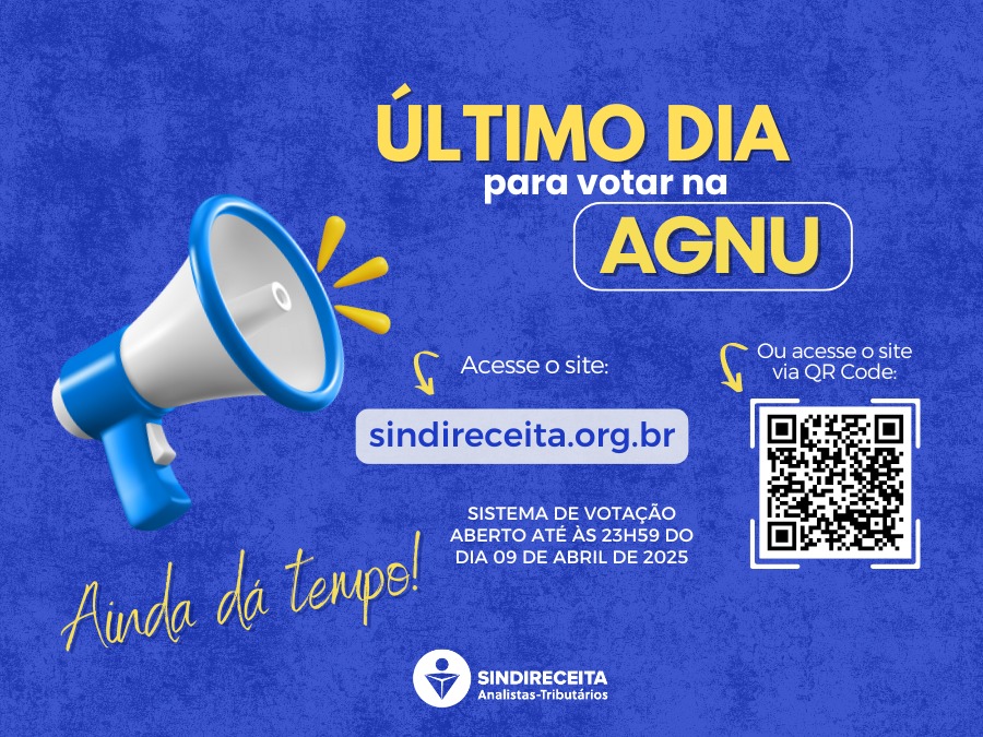 Colega filiada e filiado: hoje é o último dia para registrar o seu voto na nossa Assembleia Geral Nacional Unificada (AGNU)! A Diretoria Executiva Nacional (DEN) ressalta que a votação segue aberta até às 23h59 desta quarta-feira, dia 9. Para participar, os Analistas-Tributários e Analistas-Tributárias ativos(as) e aposentados(as) devem acessar o Sistema Eletrônico de Votação (clique aqui para votar nos Indicativos da AGNU).