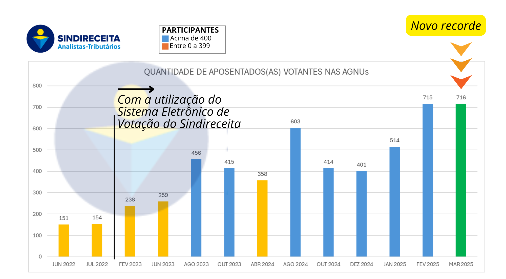 Cabe destacar que a participação dos Analistas-Tributários e Analistas-Tributarias, aposentados e aposentadas. Foi a maior registrada até agora. Foram 716 votos, que comprovam a importância do Sistema de Votação Eletrônico na busca de se ter maior participação dos filiados e filiadas nas decisões da categoria.