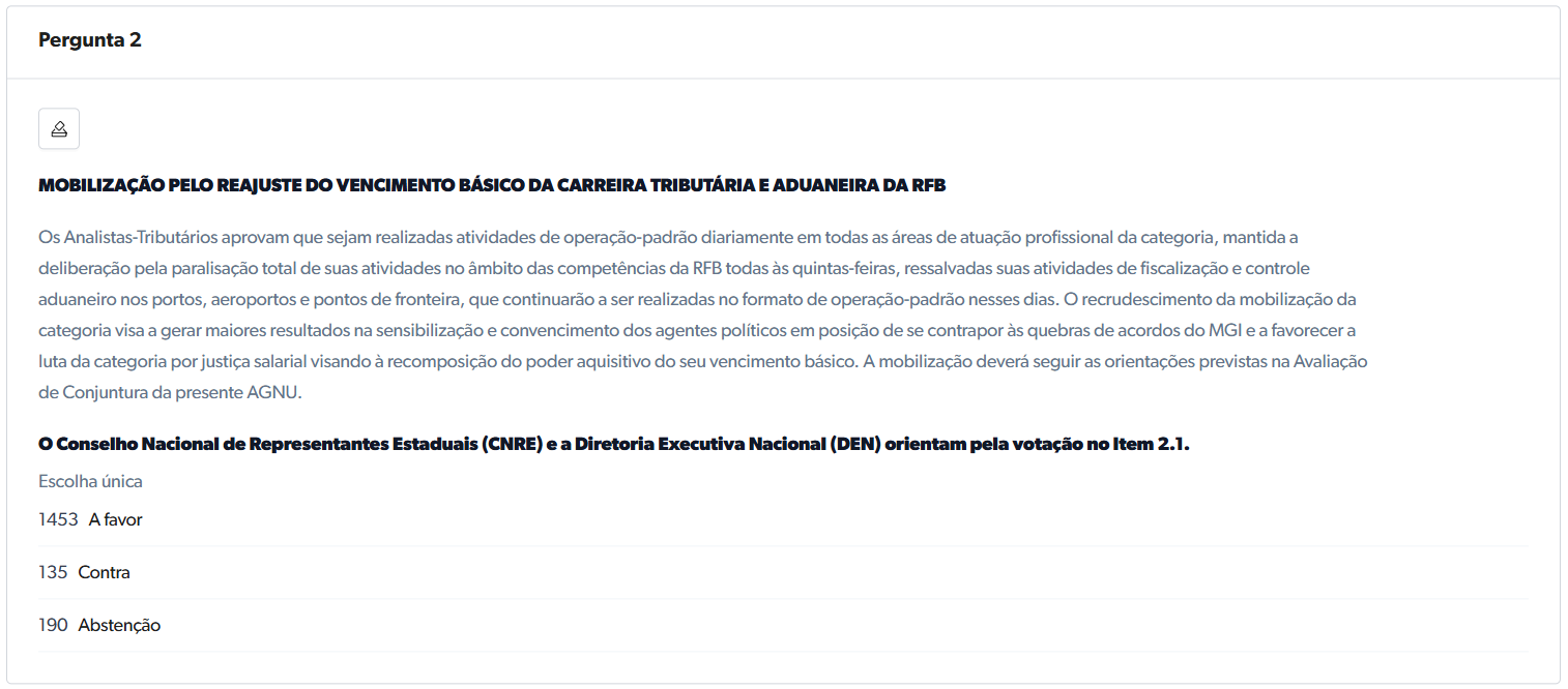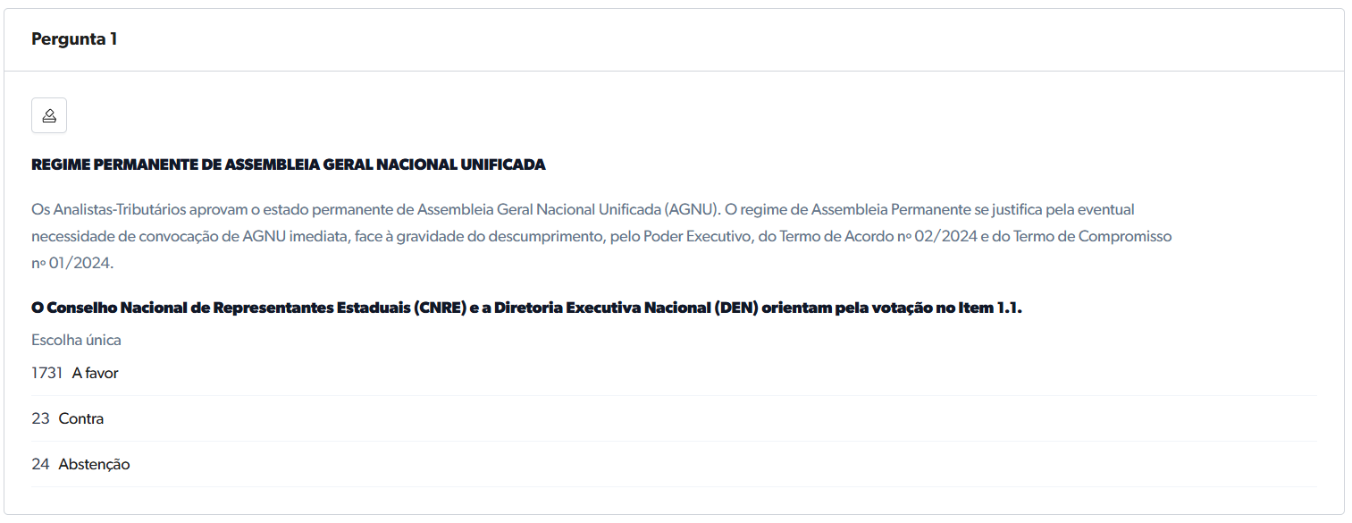 Ao aprovar o Indicativo 1, por 97,35% dos votos favoráveis (1.731 a favor, 23 contrários e 24 abstenções), os Analistas-Tributários e as Analistas-Tributárias decidiram em manter o Estado Permanente de Assembleia Geral Nacional Unificada. O regime de Assembleia Permanente se justifica pela eventual necessidade de convocação de AGNU imediata, face à gravidade do descumprimento, pelo Poder Executivo, do Termo de Acordo nº 02/2024 e do Termo de Compromisso nº 01/2024.