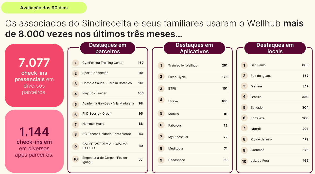 Os filiados do Sindireceita e seus dependentes usaram o Wellhub mais de 8 mil vezes nos últimos três meses. Neste período, foram realizados mais de 7 mil check-ins presenciais em academias e outras empresas parceiras e mais de 1.140 check-ins em aplicativos, o que representou um aumento de 56% em assinaturas e de 61% em cadastros.