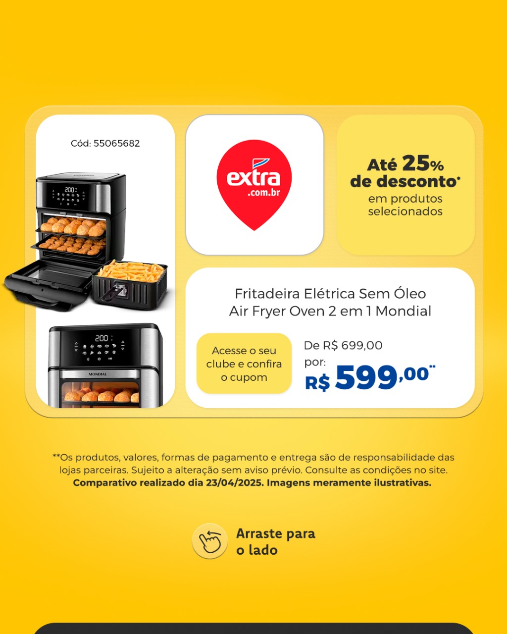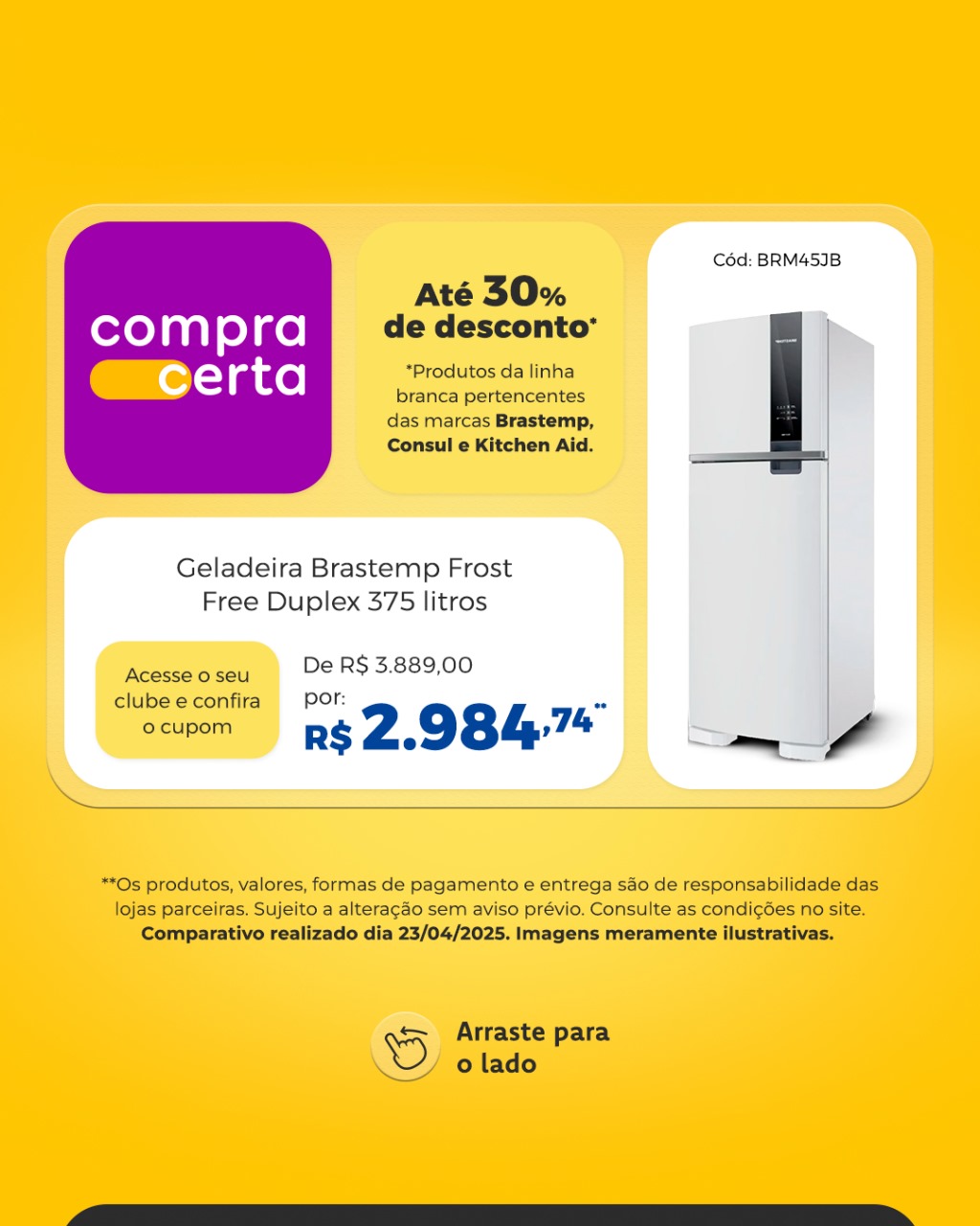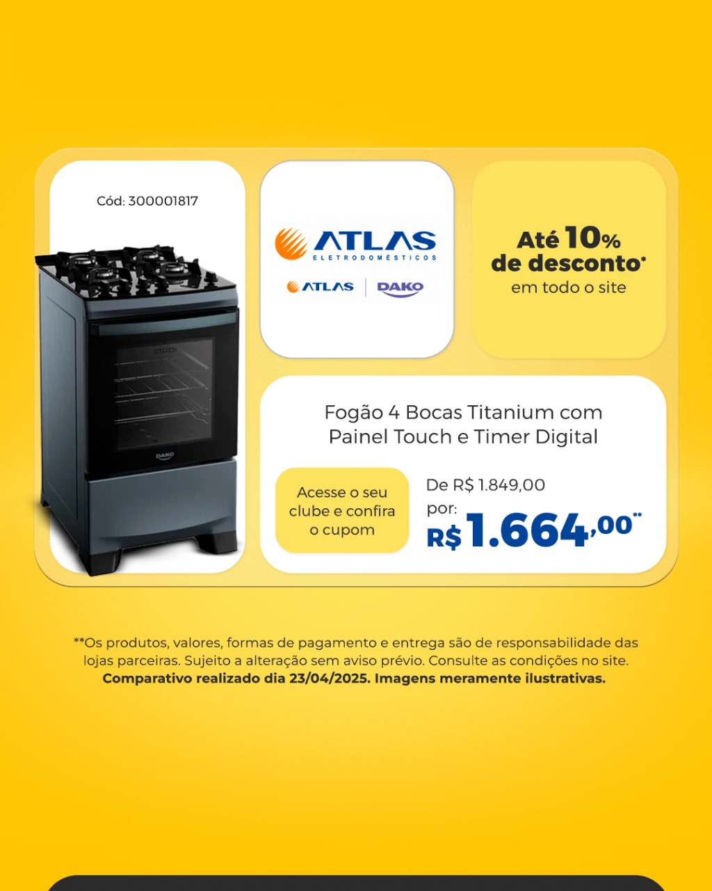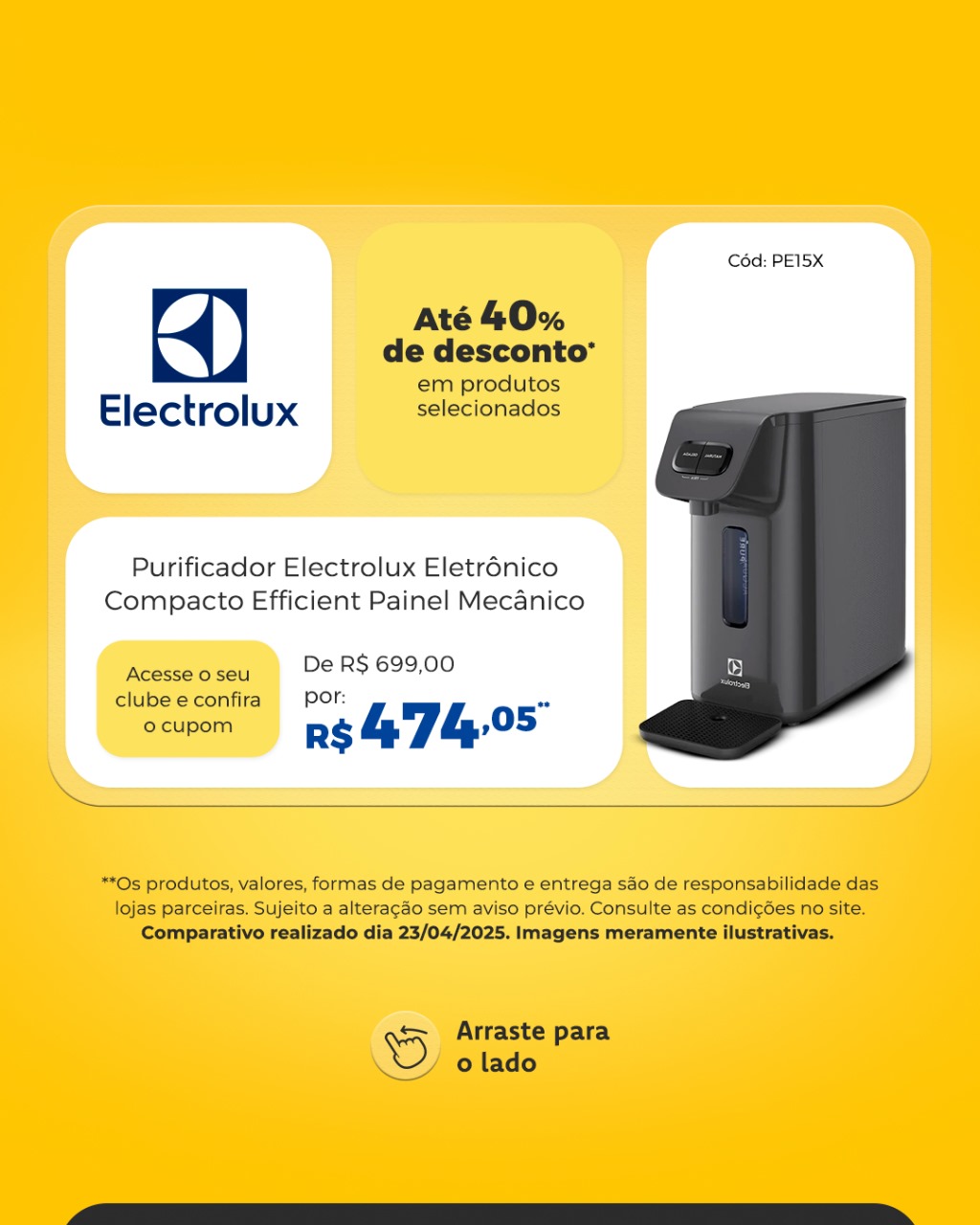Confira: descontos de até 30% no Compra Certa, com destaque para a Geladeira Brastemp Frost Free Duplex 375l; descontos de até 40% em produtos selecionados no site da Electrolux, com destaque para o Purifcador Electrolux eletrônico; descontos de até 25% em produtos selecionados no site do Extra, com destaque para a Fritadeira Elétrica sem óleo Air Fryer Oven 2 em 1 Mondial; e descontos de até 10% em todo o site da Atlas eletrodomésticos, com destaque para o Fogão 4 bocas titanium com painel touch e timer digital.