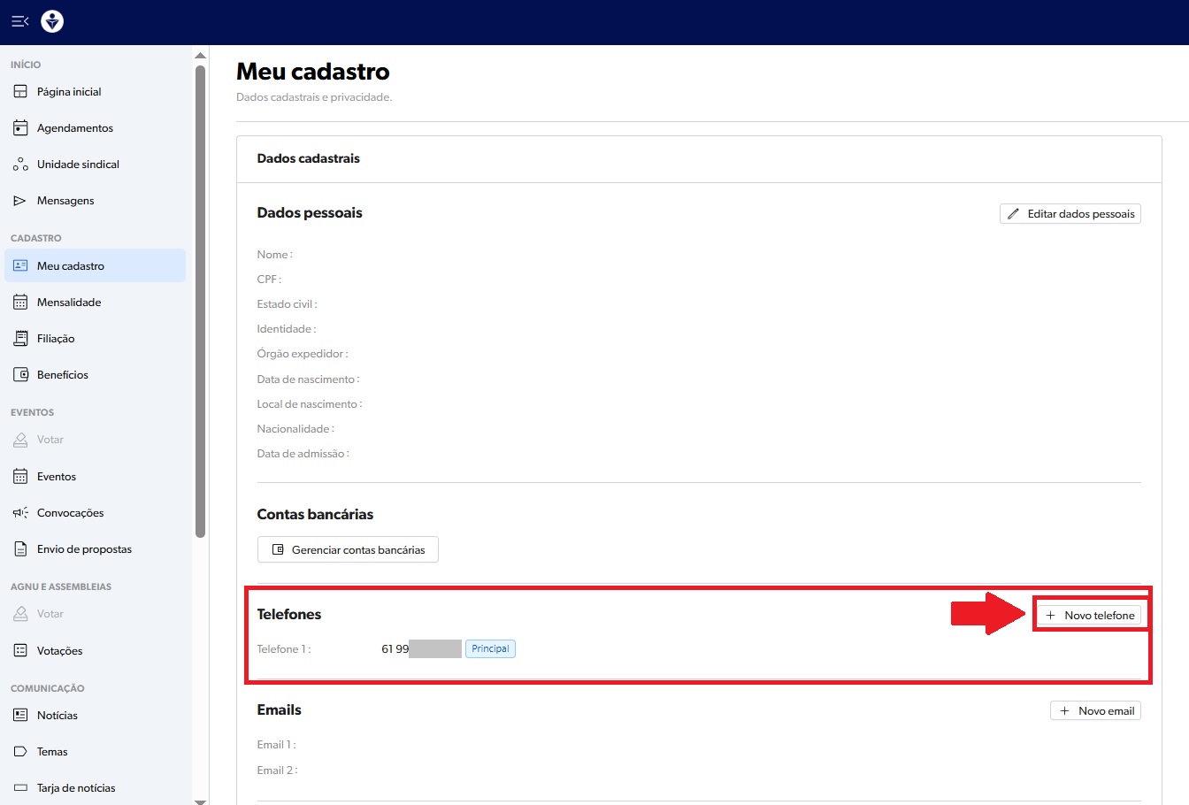No campo "Meu cadastro", você poderá atualizar várias informações, como telefone, e-mail, endereço, entre outros dados. Caso você verifique que o seu número de celular, presente na opção “Telefones”, está desatualizado, basta clicar em “Novo telefone” para alterar o seu contato.