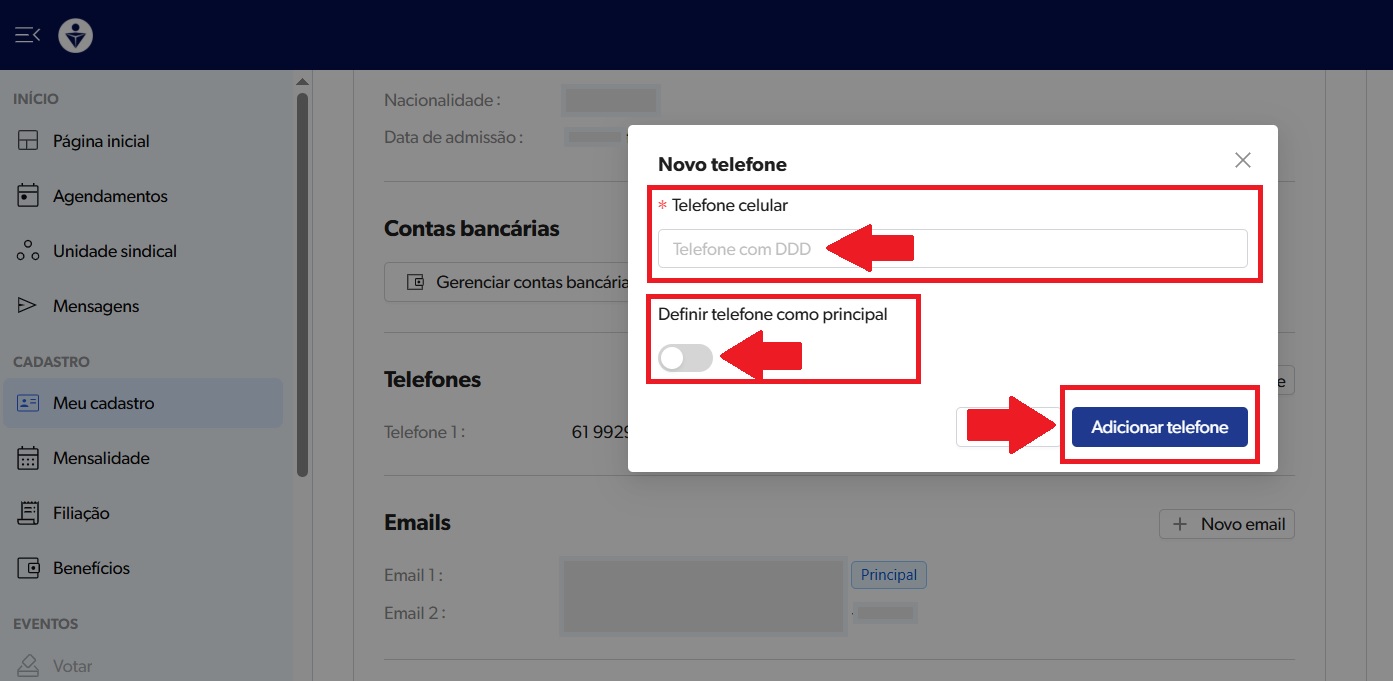 No campo "Meu cadastro", você poderá atualizar várias informações, como telefone, e-mail, endereço, entre outros dados. Caso você verifique que o seu número de celular, presente na opção “Telefones”, está desatualizado, basta clicar em “Novo telefone” para alterar o seu contato.