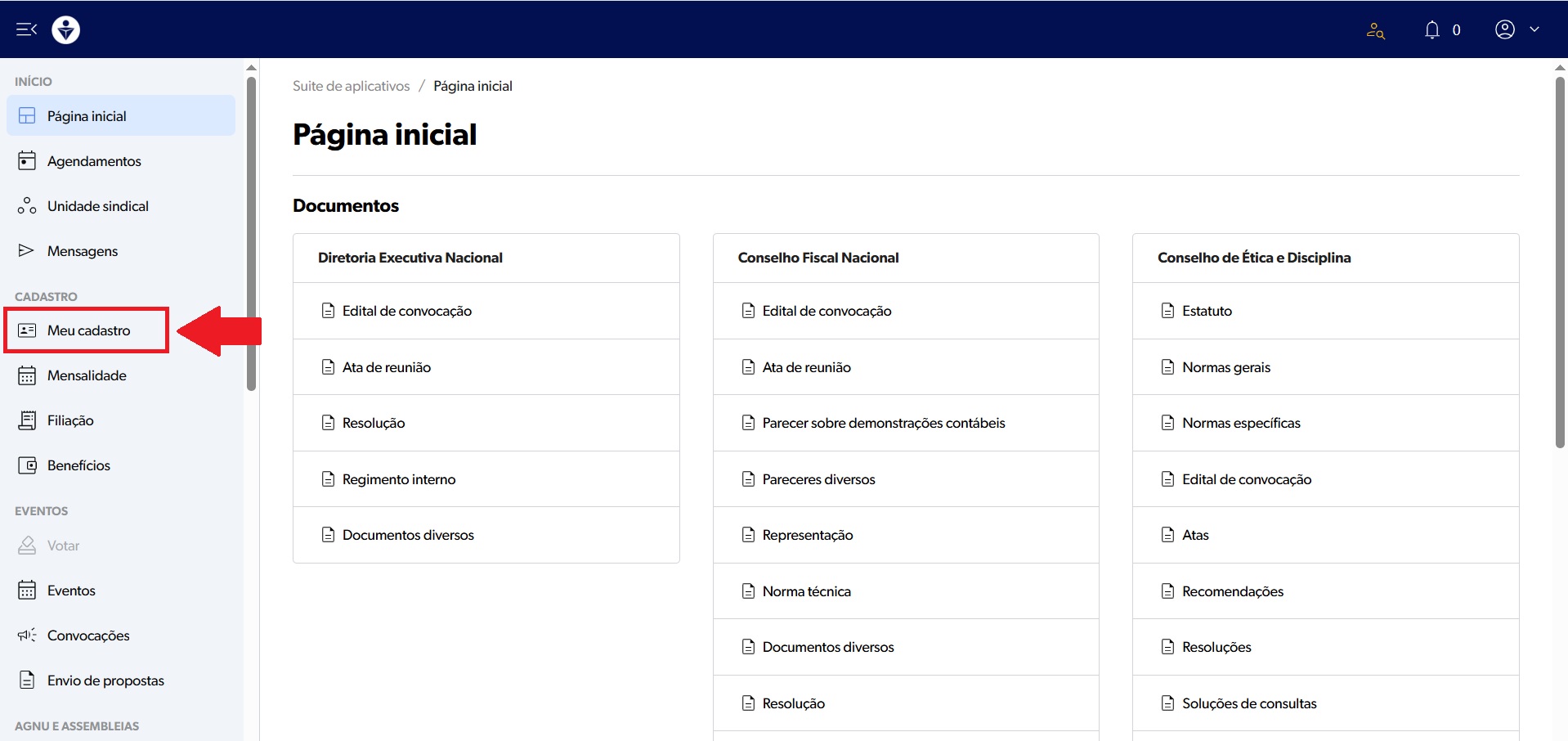 Após acessar a Suíte de Aplicativos, clique na opção “Meu cadastro”, presente no menu lateral esquerdo da tela.