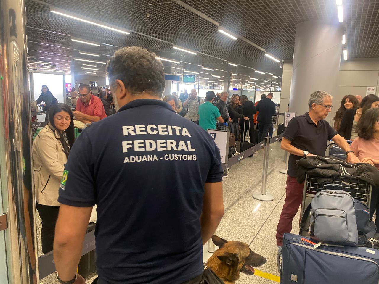 Analistas-Tributários da Receita Federal do Brasil, em conjunto com Auditores-Fiscais intensificaram as ações de fiscalização nesta quinta-feira, dia 8, como parte de uma operação-padrão, no Aeroporto Internacional de Confins/MG, com foco em um voo procedente de Lisboa, Portugal, que transportava 217 passageiros.
