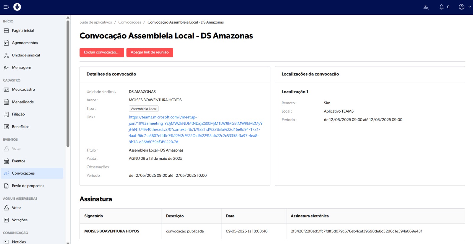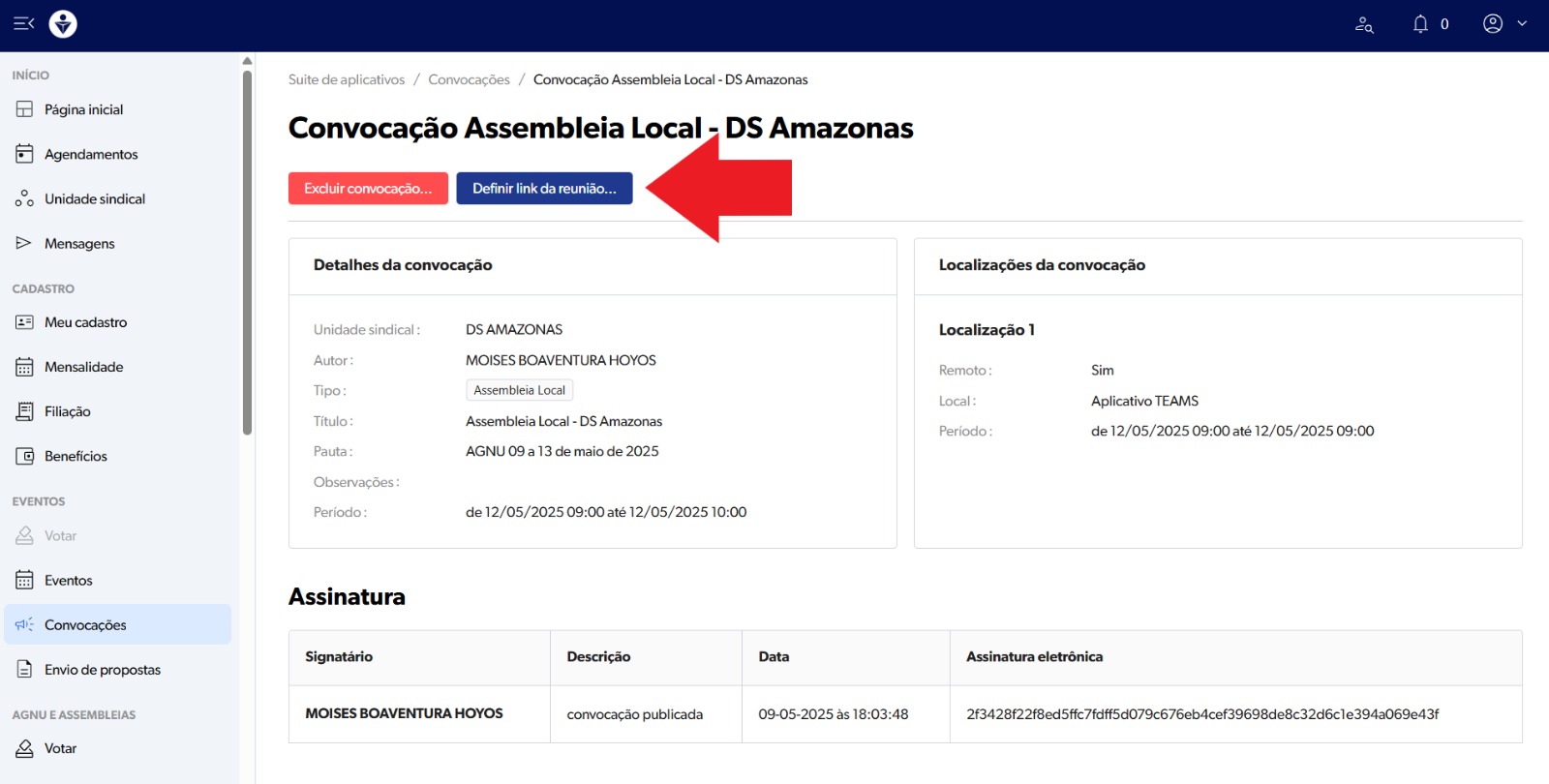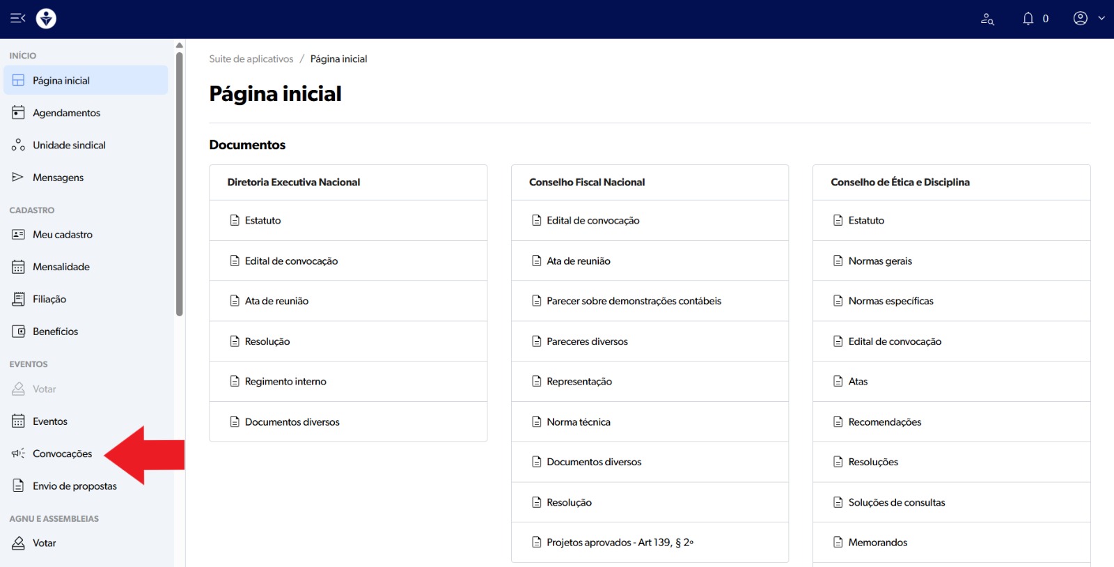 Entre na área restrita (O delegado ou competente para chamar uma Assembleia da Delegacia Sindical) e clique em CONVOCAÇÕES: