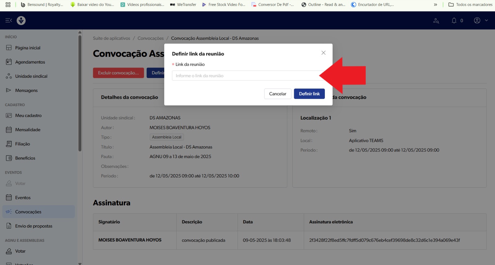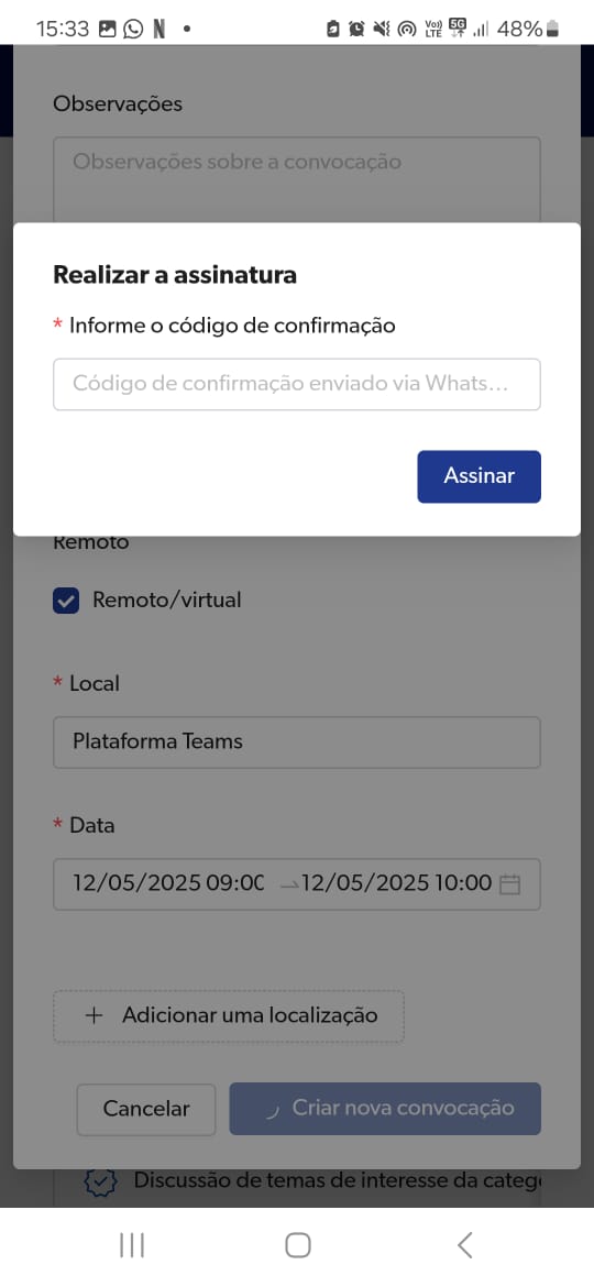 Quando clicar no botão CRIAR NOVA CONVOCAÇÃO, o sistema enviará um código via WhatsApp. Informe o código de confirmação e clica em ASSINAR