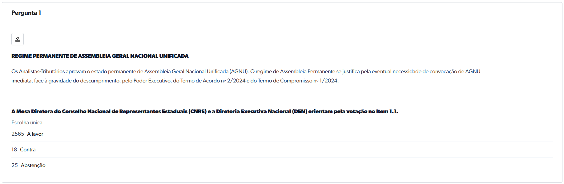 Ao aprovar o Indicativo 1, por 98,35% dos votos favoráveis (2.565 a favor, 18 contrários e 25 abstenções), os Analistas-Tributários e as Analistas-Tributárias decidiram em manter o Estado Permanente de Assembleia Geral Nacional Unificada. O regime de Assembleia Permanente se justifica pela eventual necessidade de convocação de AGNU imediata.