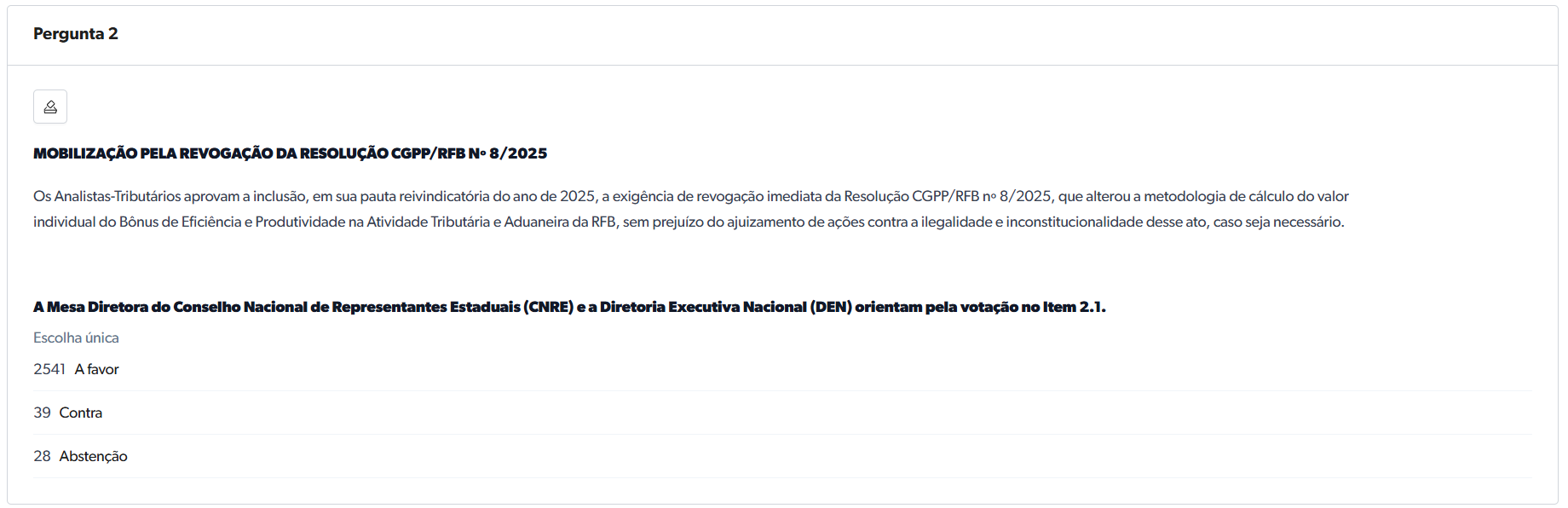 O Indicativo 2 teve 97,43% dos votos favoráveis (2.541 favoráveis, 39 contrários e 28 abstenções) para a aprovação da inclusão na pauta reivindicatória do ano de 2025, a exigência de revogação imediata da Resolução CGPP/RFB nº 8/2025, que alterou a metodologia de cálculo do valor individual do Bônus de Eficiência e Produtividade na Atividade Tributária e Aduaneira da RFB, sem prejuízo do ajuizamento de ações contra a ilegalidade e inconstitucionalidade desse ato, caso seja necessário.