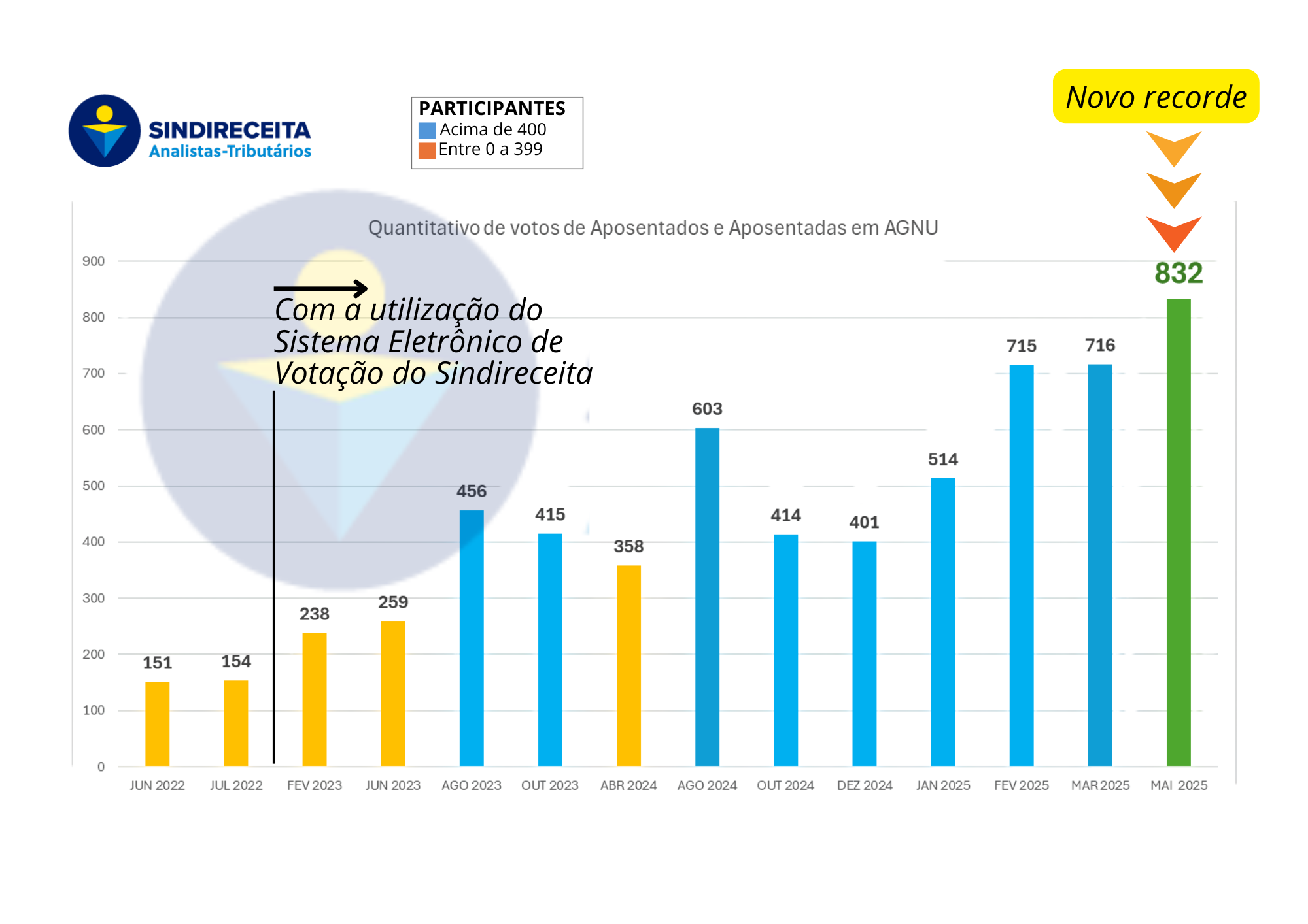 O gráfico demostra que a participação dos aposentados e aposentados nas votações das AGNUs quintuplicou, passando de 154 votos em julho de 2022 para 832 votos em maio de 2025.