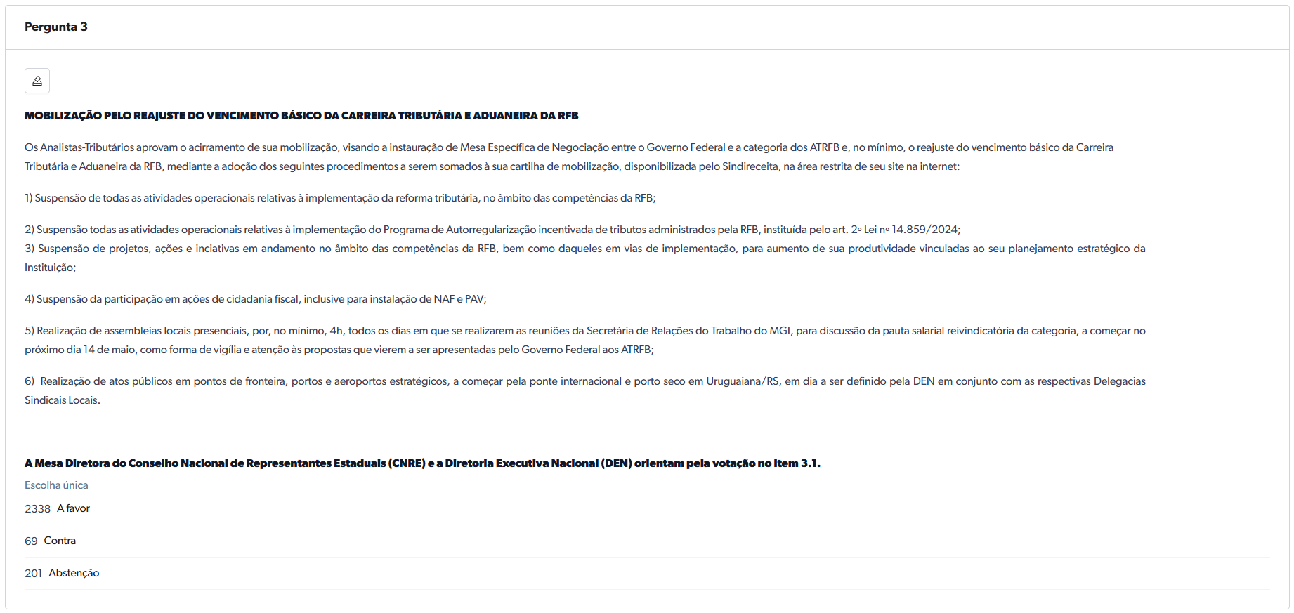 O Indicativo 3 aprovou, com 89,64% dos votos (2.338 a favor, 69 contra e 201 abstenções), o acirramento da mobilização, visando a instauração da Mesa Específica de Negociação entre o Governo Federal e a categoria dos ATRFB e, no mínimo, o reajuste do vencimento básico da Carreira Tributária e Aduaneira da RFB. O acirramento se dará por meio dos seguintes procedimentos: