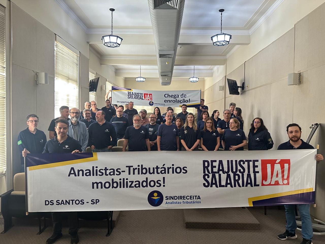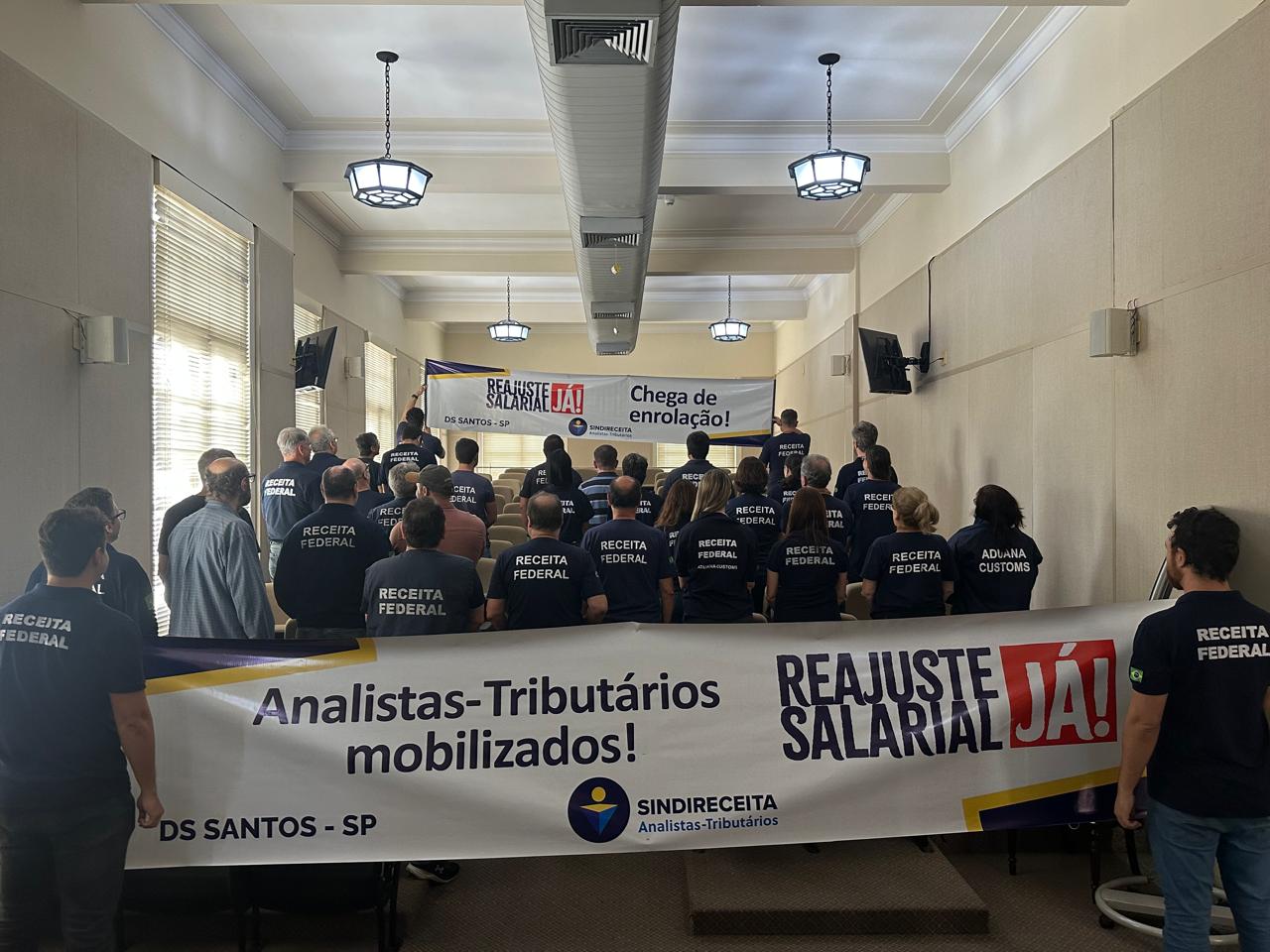 Analistas-Tributários da Receita Federal do Brasil da DS Santos/SP reuniram-se nesta terça-feira, dia 13, na Alfândega do Porto de Santos/SP, para discutir a implementação da operação- padrão, visando fortalecer a mobilização da categoria em defesa de suas atribuições e condições de trabalho.