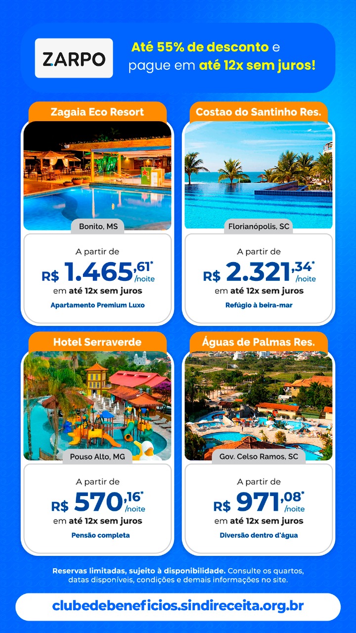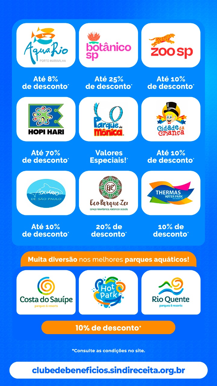 O Clube de Benefícios do Sindireceita oferece uma série de descontos e grandes oportunidades de férias em família. Aproveite as ofertas e viaje em família nas férias de julho. São inúmeras as ofertas especiais oferecidas pelos parceiras do Clube de Benefícios do Sindireceita aos filiados do Sindicato.