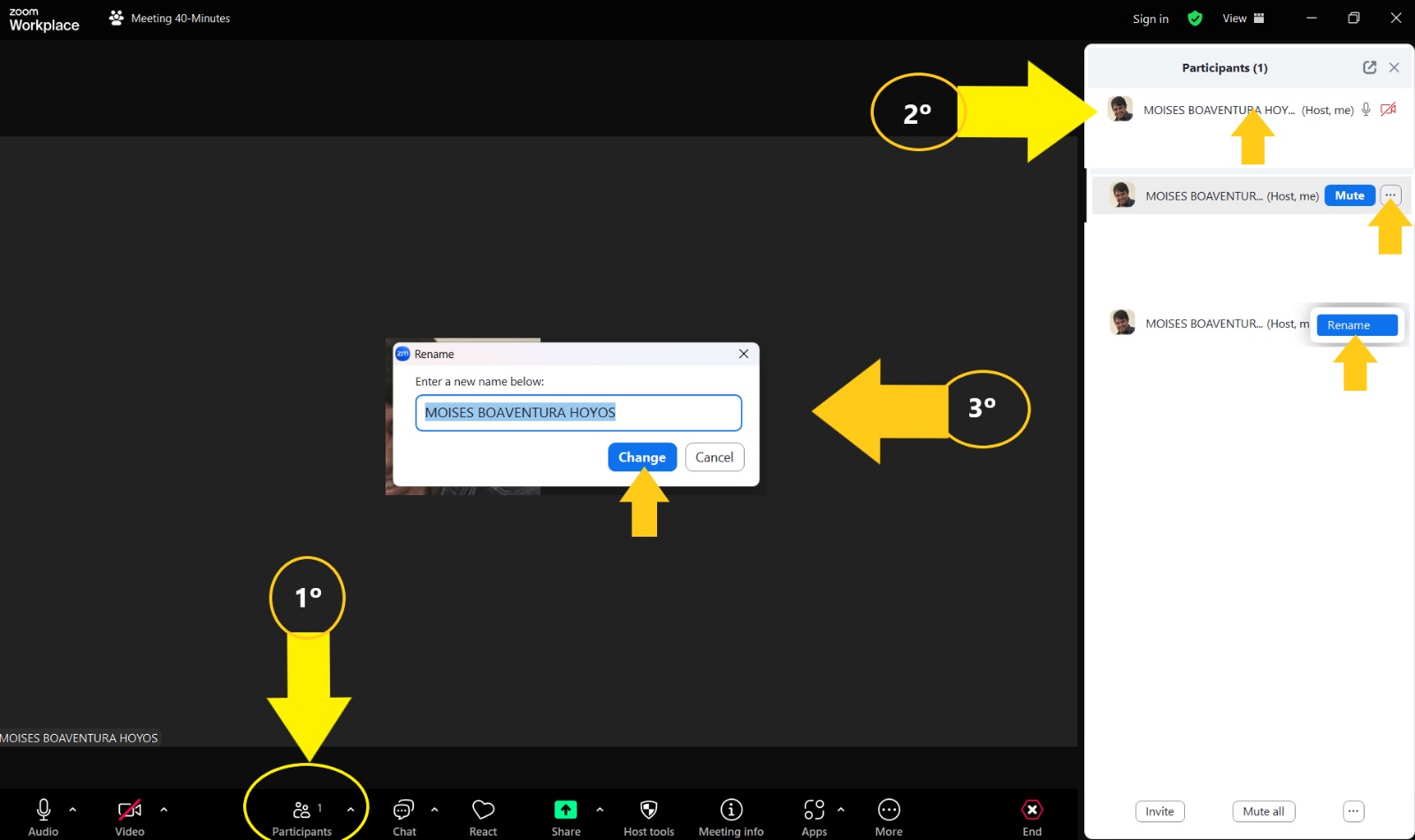 Para alterar o seu nome no Zoom, acesse o portal da web Zoom e, no menu de navegação, clique em "Perfil". Depois, clique em "Editar" ao lado do seu nome de perfil e insira o nome e sobrenome desejados, bem como o nome de exibição que será mostrado aos outros participantes nas reuniões.