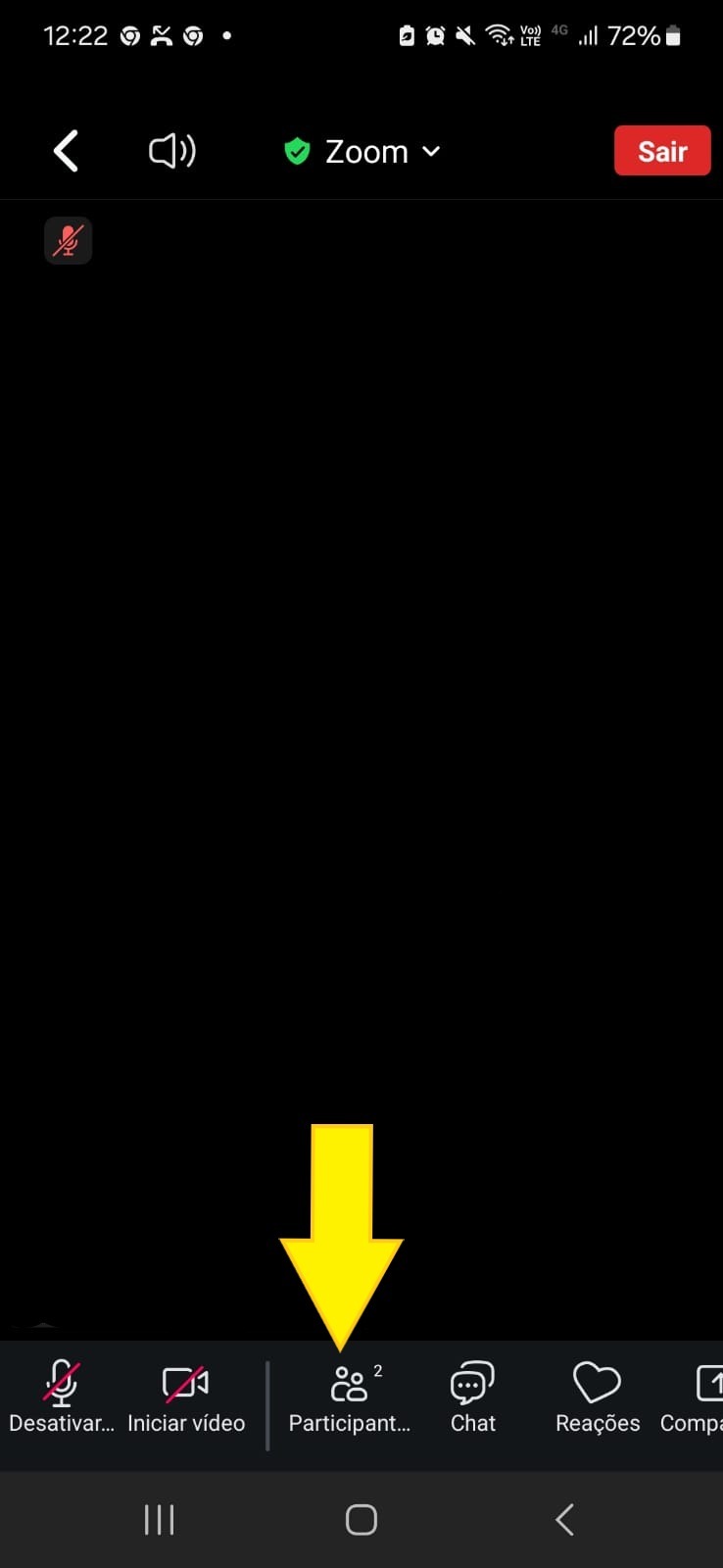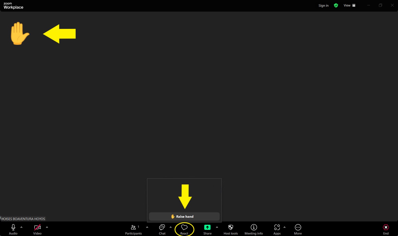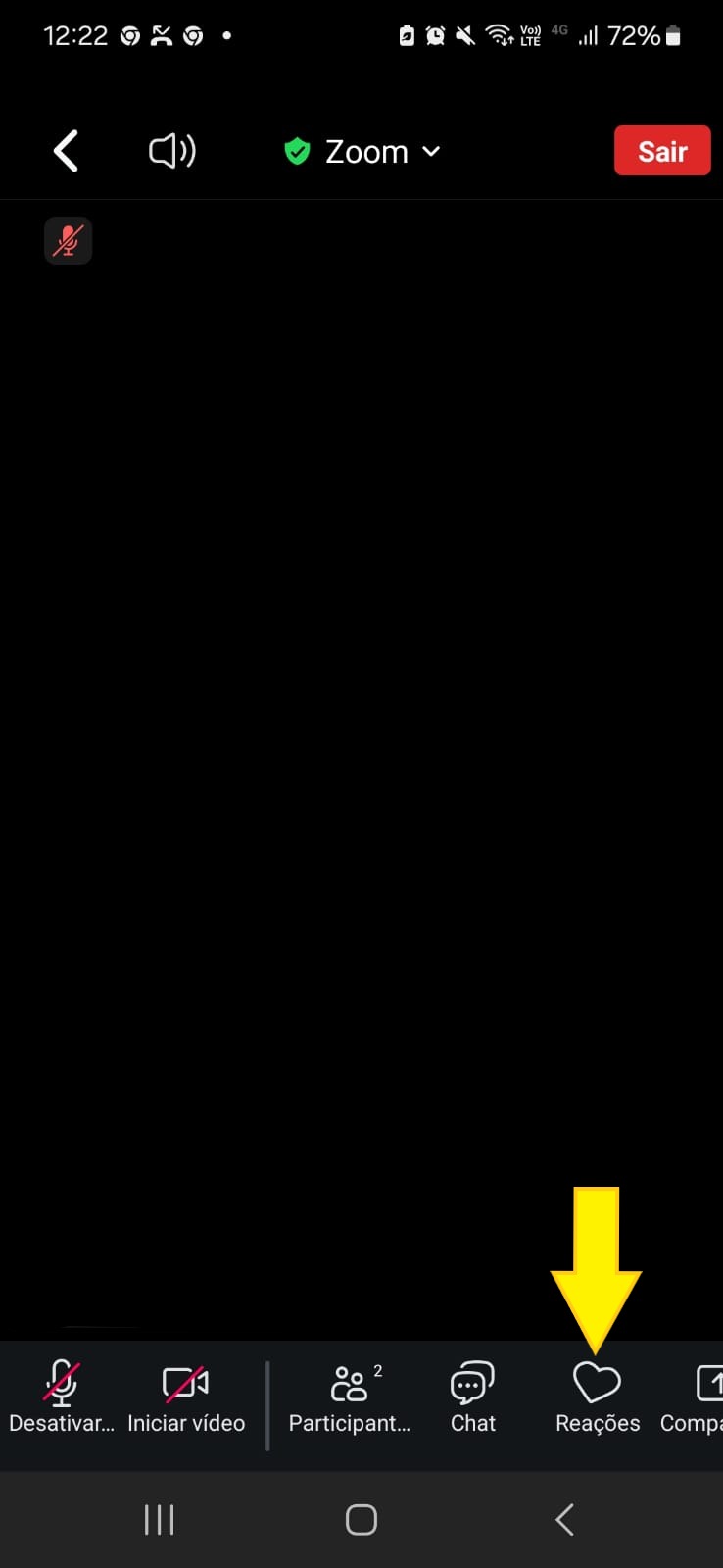 Para ativar o recurso Levantar a mão basta clicar o botão em “Reações” na parte inferior da janela do Zoom. Quando o filiado participante levanta a mão, o ícone da mão é mostrado na caixa do Zoom, assim como seu nome na lista de participantes.