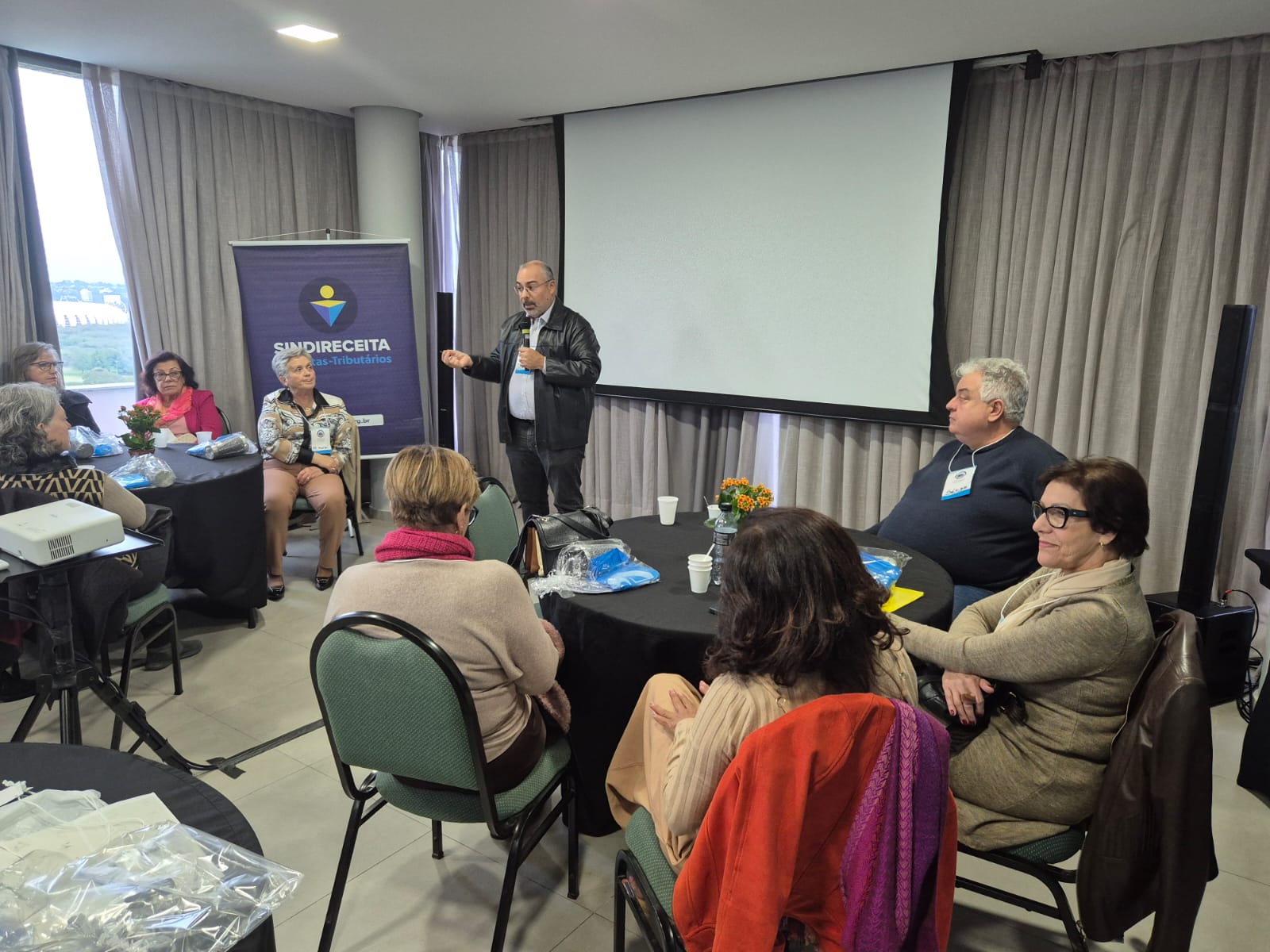 Durante o evento, o presidente do Sindireceita, Thales Freitas saudou os colegas e conduziu avaliação de conjuntura focada, sobretudo, na negociação salarial da categoria. Neste sentido, Freitas detalhou os esforços conduzidos pelo Sindireceita, no âmbito da negociação junto ao Ministério da Gestão e da Inovação em Serviços Públicos (MGI), visando a garantia dos direitos e o atendimento às reivindicações dos aposentados, aposentadas e pensionistas. “Todos e todas aqui presentes são um povo de virtude. Fico muito feliz de ter condições de estar aqui, no Rio Grande do Sul, com os nossos colegas filiados e filiadas. Será um evento maravilhoso e temos muitas informações para transmitir aos aposentados”, declarou.