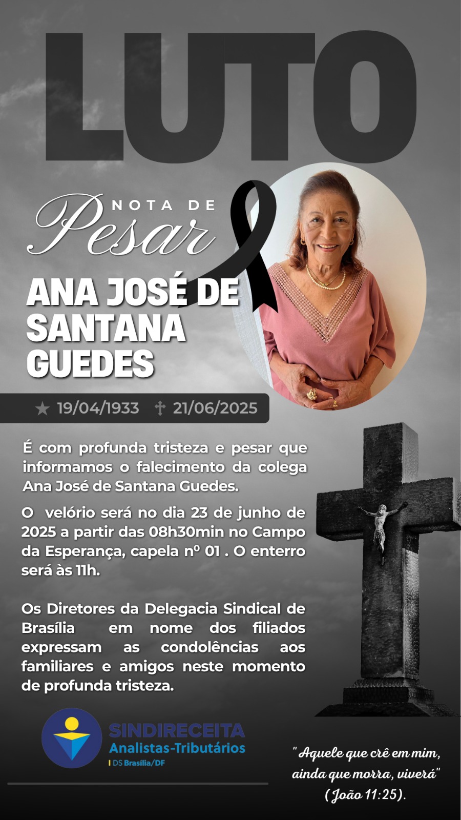 A Diretoria Executiva Nacional (DEN) e a Delegacia Sindical de Brasilia/DF, manifestam seus profundos sentimentos de pesar pelo falecimento da analista-tributária da Receita Federal do Brasil, Ana José de Santana Guedes. Expressamos nossa solidariedade a todos os entes queridos, familiares e amigos, neste momento de luto e saudade.