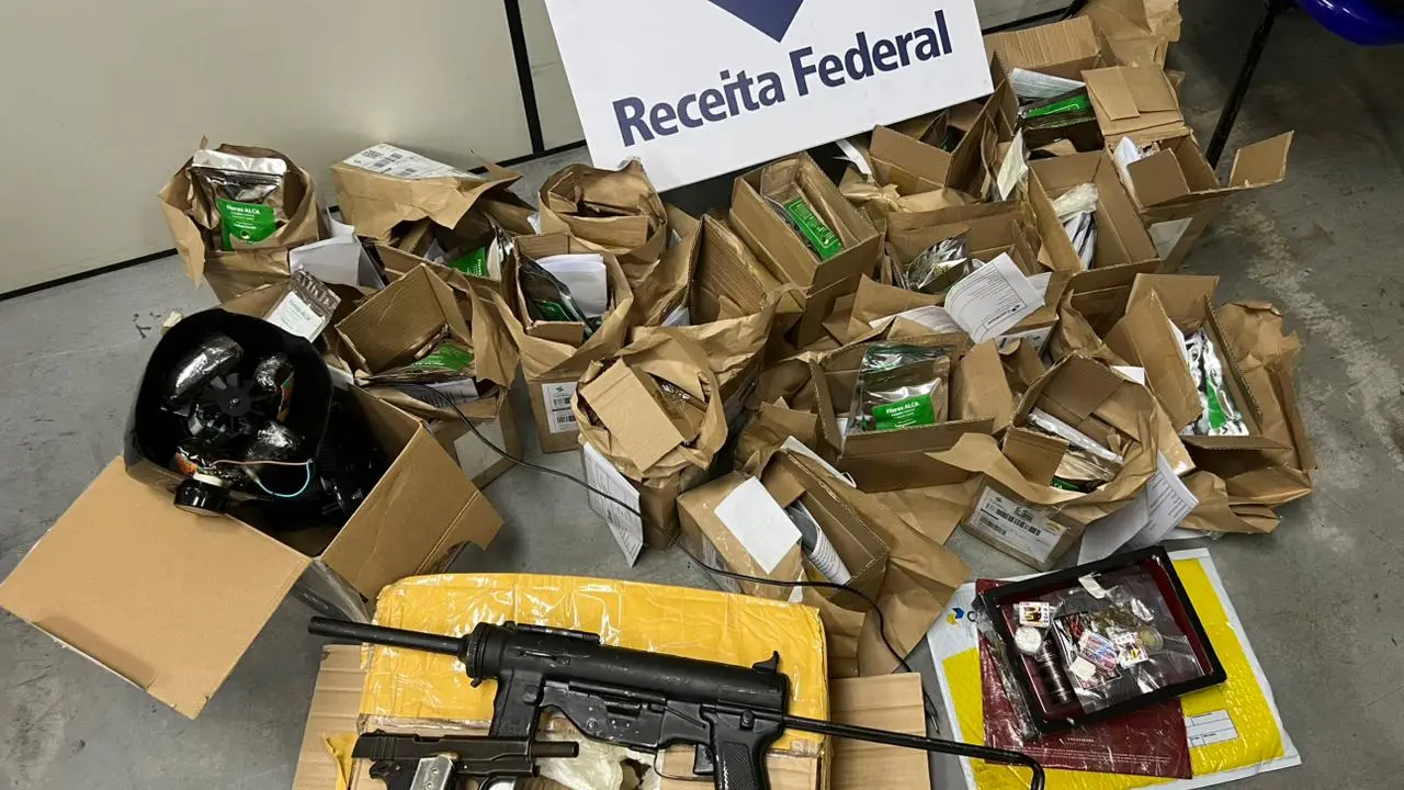 Analistas-Tributários(as) da Receita Federal atuaram na apreensão, nesta quarta-feira,(24/06), de vinte e três encomendas que escondiam armas e drogas no Centro de Distribuição dos Correios, no Rio de Janeiro. A fiscalização, que contou com o apoio de cães de faro, localizou uma metralhadora de mão calibre .45, uma pistola do mesmo calibre, 350 gramas de maconha, 500 gramas de haxixe, além de canetas e frascos de Monjauro — substância com uso restrito.