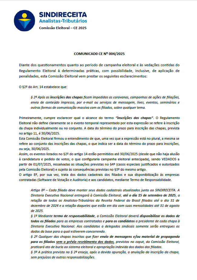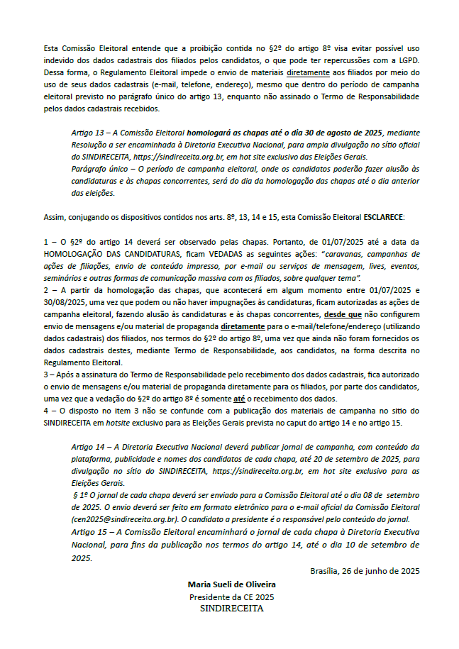2 – A partir da homologação das chapas, que acontecerá em algum momento entre 01/07/2025 e 30/08/2025, uma vez que podem ou não haver impugnações às candidaturas, ficam autorizadas as ações de campanha eleitoral, fazendo alusão às candidaturas e às chapas concorrentes, desde que não configurem envio de mensagens e/ou material de propaganda diretamente para o e-mail/telefone/endereço (utilizando dados cadastrais) dos filiados, nos termos do §2º do artigo 8º, uma vez que ainda não foram fornecidos os dados cadastrais destes, mediante Termo de Responsabilidade, aos candidatos, na forma descrita no Regulamento Eleitoral.