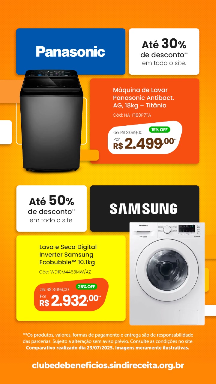 Nesta semana, filiadas e filiados contam com descontos exclusivos em eletrodomésticos selecionados, como máquina de lavar, secadora, fogão, robô aspirador, geladeira, cafeteira, ar-condicionado e muito mais.