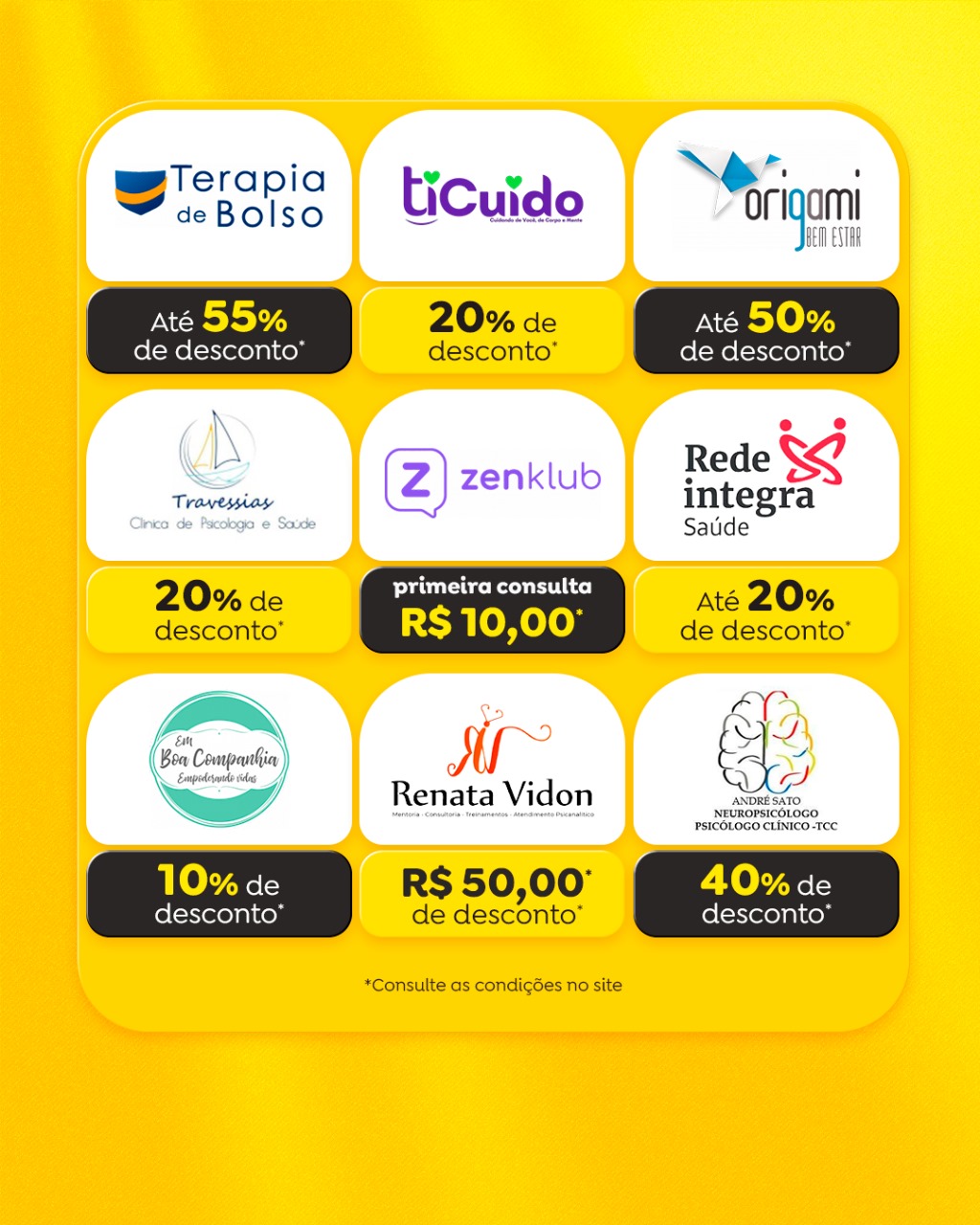 Filiadas e filiados têm acesso a descontos em videoconsultas com psicólogos, centros de saúde integrativa, atendimentos neuropsicológicos e muito mais.