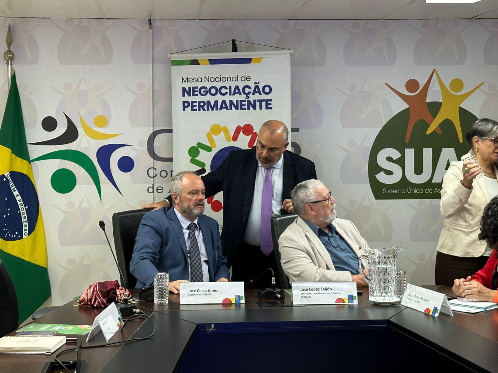 O presidente do Sindireceita, Thales Freitas, e o diretor de Assuntos Parlamentares, Sérgio Ricardo Moreira, participaram da 12ª Reunião da Mesa Nacional de Negociação Permanente (MNNP), realizada nesta quarta-feira, 22 de outubro. O encontro aconteceu na sala do Conselho Nacional de Assistência Social (CNAS) e reuniu representantes do governo federal e de entidades representativas das servidoras e dos servidores públicos.