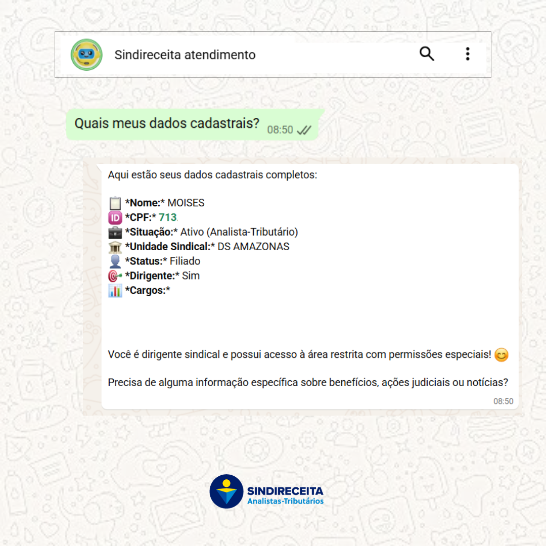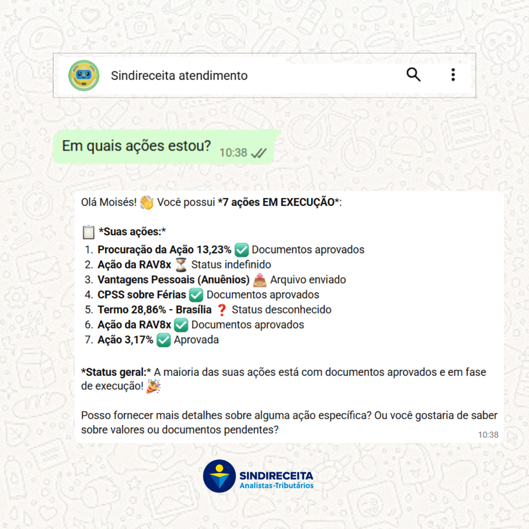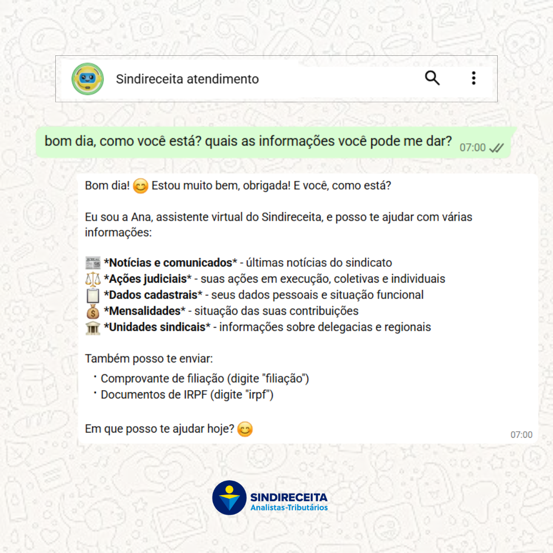 É muito importante, especialmente durante as primeiras interações que os filiados façam perguntas diretas e específicas. Assim como toda ferramenta de IA, a assertividade e a objetividade das respostas tornam-se cada vez mais eficiente a cada interação. A Diretoria Executiva Nacional ressalta que, caso as respostas não contemplem as solicitações e ou apresentem falhas e inconsistências, os filiados devem informar à DEN por meio do endereço eletrônico comunicacao@sindireceita.org.br