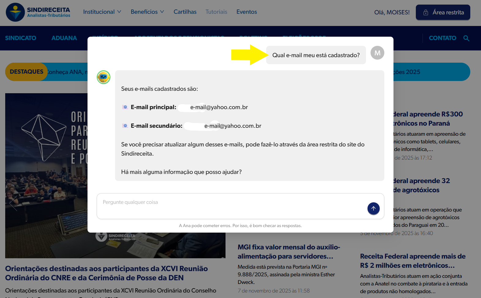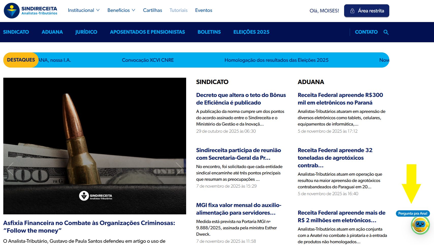 A novidade pode ser notada logo na página principal do Sindireceita, onde o ícone da ANA, acompanhado da mensagem "Pergunte para Ana", convida o filiado a interagir com a nova ferramenta. O verdadeiro potencial da IA será explorado na Área Restrita do site, um espaço exclusivo que garante a segurança e a personalização das informações.