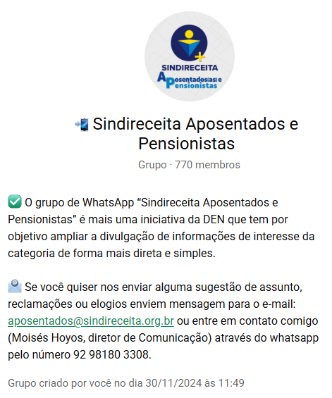 Lembramos que o grupo é exclusivo para aposentados, aposentadas e pensionistas filiados.