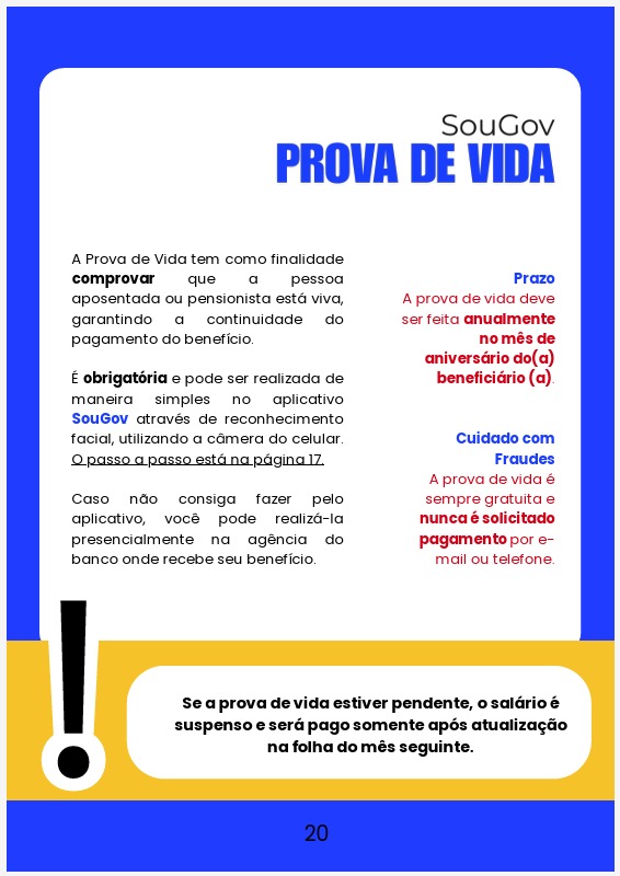 Outro importante material sobre o assunto é a "Cartilha para você que se aposentou”, lançada junho pela Decipex. Além de detalhes sobre a Prova de Vida, a publicação reúne orientações sobre serviços oferecidos durante a fase de aposentadoria e esclarecimentos de dúvidas frequentes.