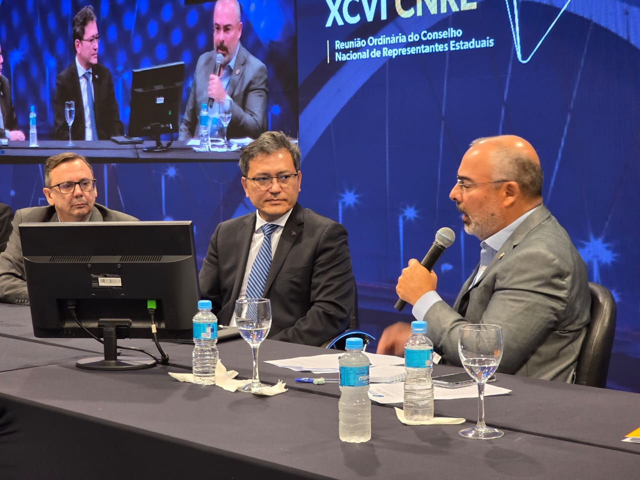 O secretário da Receita Federal do Brasil, Robinson Barreirinhas, participou nesta quinta-feira, dia 4, da XCVI Reunião Ordinária do Conselho Nacional de Representantes Estaduais (CNRE) do Sindireceita. O secretário destacou o compromisso da administração com a valorização dos servidores e o fortalecimento institucional da Receita Federal. “Fiz questão de estar aqui hoje para agradecer aos Analistas-Tributários por tudo que fizeram pela Receita Federal”, completou.