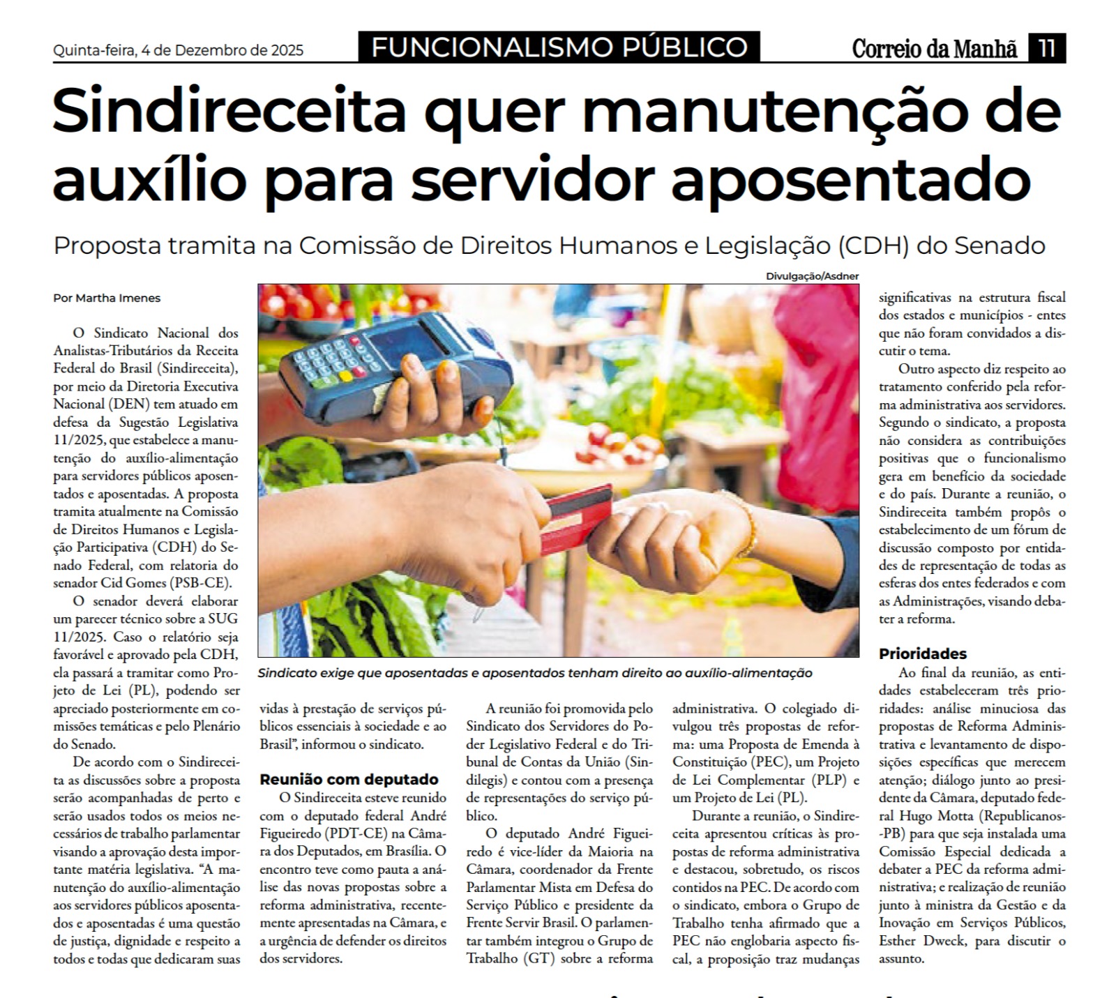 O jornal Correio da Manhã, na edição de quinta-feira, dia 4, deu destaque ao trabalho realizado pelo Sindireceita visando a manutenção do auxílio-alimentação para servidores públicos aposentados e aposentadas.