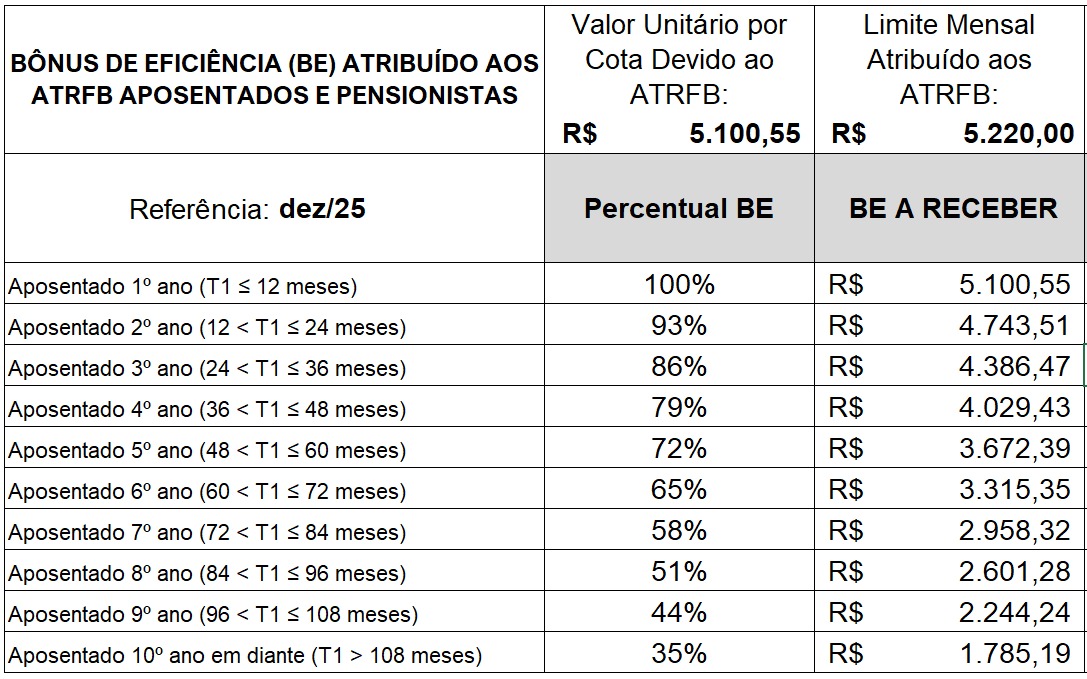 A Direção Executiva Nacional (DEN) comunica a todos os Analistas-Tributários e Analistas-Tributárias da Receita Federal do Brasil (ATRFB) que está disponibilizando planilha para a conferência dos valores referentes ao Bônus de Eficiência (BE) para ativos, aposentados e pensionistas. Dessa forma fica mais claro o valor que cada um vai receber e que deve constar no seu contracheque, disponível no Sou.Gov.