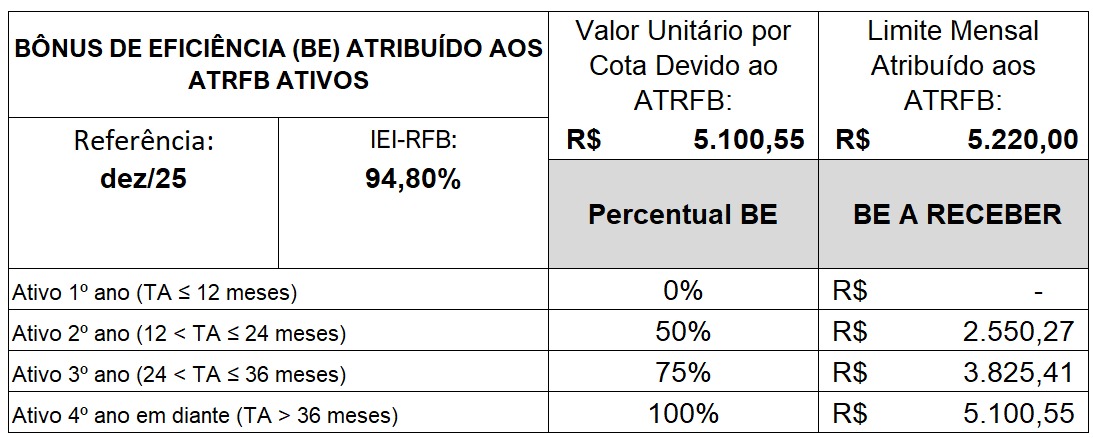 Cabe salientar que neste mês de dezembro, tivemos um saldo positivo da provisão para ajustes ao valor global do BE, em relação à apuração anterior, o que justifica a diferença, ainda que pequena, do valor unitário por cota devido ao ATRFB, de R$ 5.095,25 em novembro/25, para R$ 5.100,55 em dezembro/25.