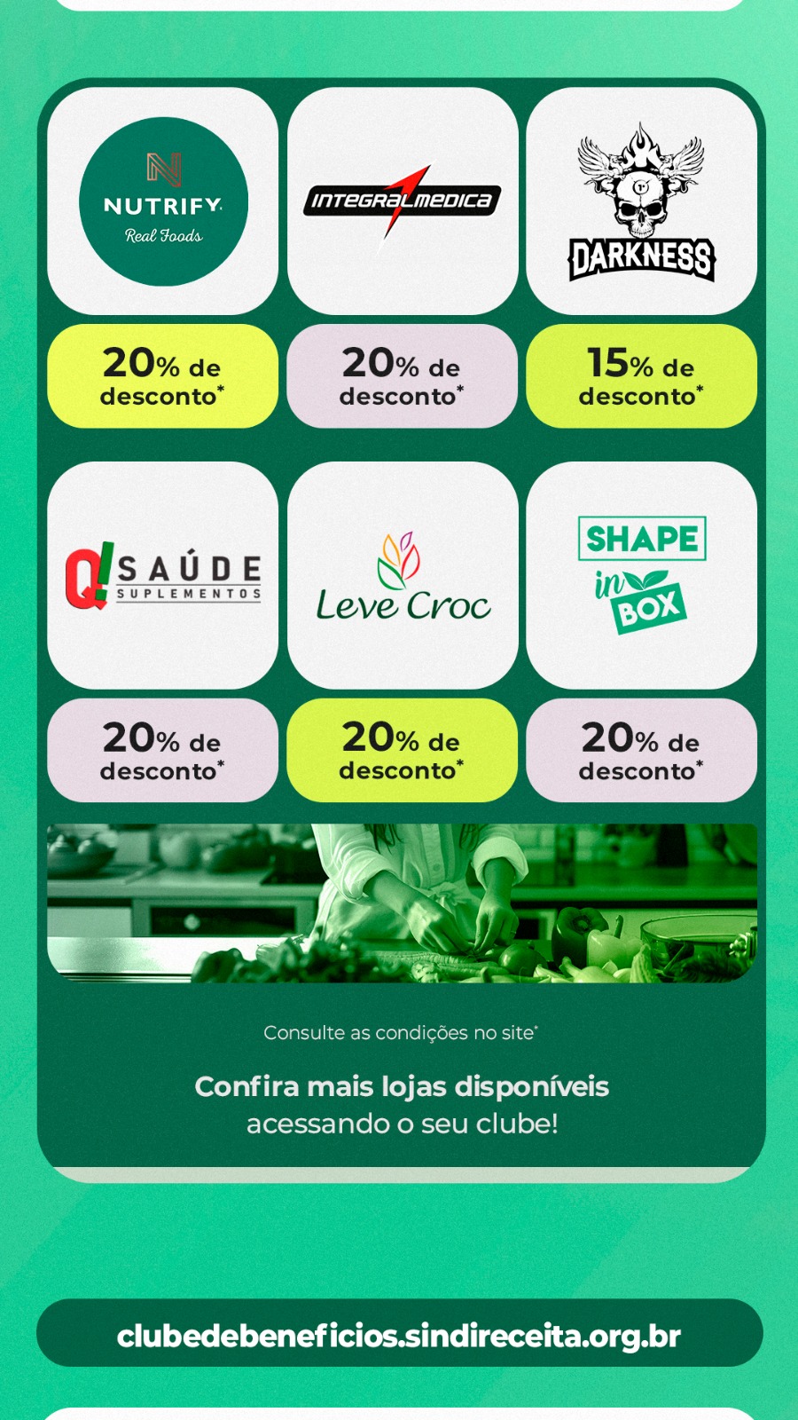 Nosso Clube garante, ainda, descontos de 20% em produtos das marcas Nutrify, Integralmedica, Q Saúde Suplementos, Leve Croc e Shape In Box; e de 15% em produtos comercializados pela Darkness. Acesse o site do Clube de Benefícios (https://clubedebeneficios.sindireceita.org.br) para consultar todas as condições e mais detalhes sobre os descontos.