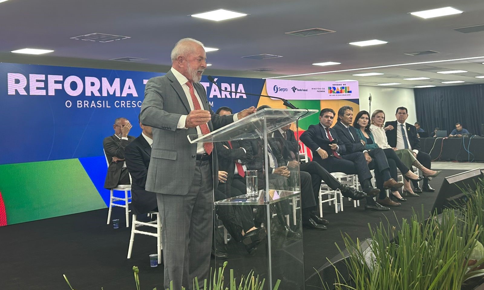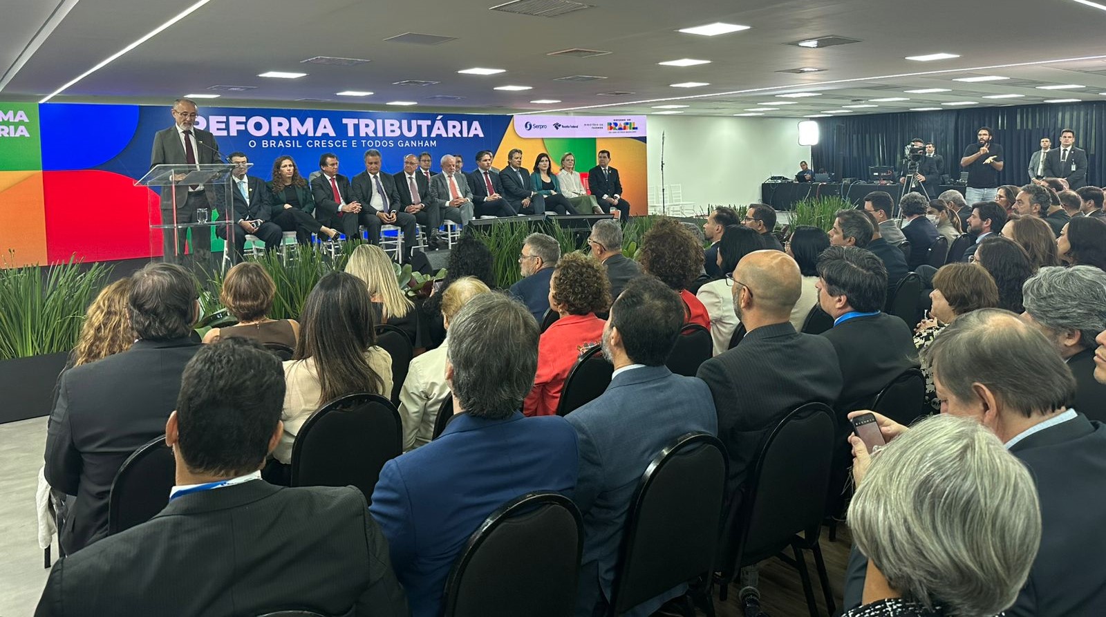 Também estiveram presentes o vice-presidente da República e ministro do Desenvolvimento, Indústria, Comércio e Serviços, Geraldo Alckmin; o ministro da Fazenda, Fernando Haddad; o secretário especial da Receita Federal do Brasil, Robinson Barreirinhas; o relator do PLP 108/2024, deputado federal Mauro Benevides (PDT-CE); e o senador Eduardo Braga (MDB-AM), responsável pela elaboração do relatório do projeto no Senado Federal. O texto, além de instituir de forma definitiva o Comitê Gestor do IBS, dispõe sobre o processo administrativo tributário, a distribuição federativa de receitas, entre outros pontos.