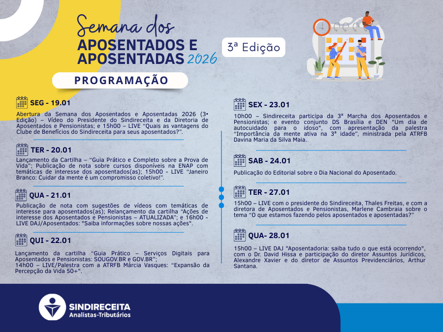A Semana dos Aposentados e Aposentadas 2026 chegou! Dos dias 19 a 23 de janeiro, o Sindireceita promoverá diversas ações em reconhecimento e homenagem a você, colega aposentado e aposentada em todo o Brasil. Neste período, realizaremos uma programação ampla, que inclui a divulgação de conteúdos especiais sobre assuntos do seu interesse em nosso site, publicação de novo episódio do Conexão Sindireceita, lançamento de cartilhas, realização de Lives e muito mais!