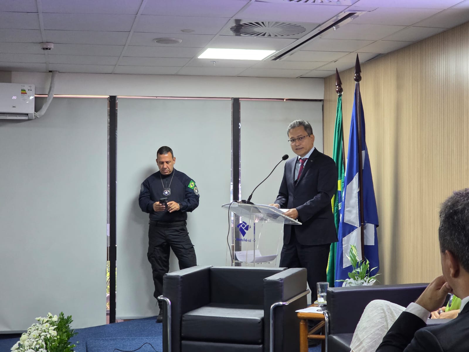 Os diretores do Sindireceita, Geronimo Sartori (Assuntos Aduaneiros) e Fabiano Rebelo (Estudos Técnicos), participaram, nessa segunda-feira, dia 26, de evento promovido pela Receita Federal do Brasil (RFB) em comemoração ao Dia Internacional das Aduanas, celebrado na data de ontem. O seminário reuniu integrantes da Carreira Tributária e Aduaneira, entre eles Analistas-Tributários e Analistas-Tributárias, além de autoridades como o secretário especial da RFB, Robinson Barreirinhas, subsecretários e subsecretárias do Órgão. O evento ocorreu no auditório do Anexo do Ministério da Defesa, em Brasília/DF.