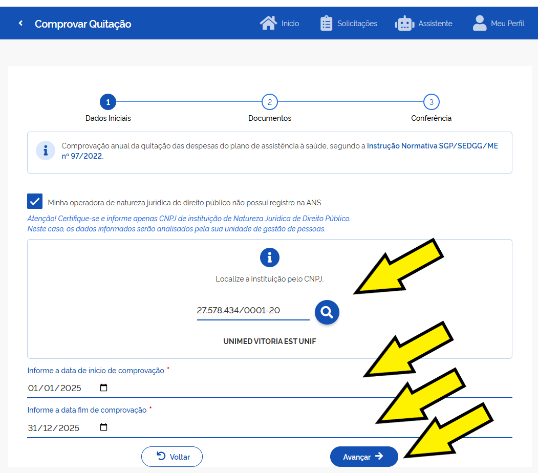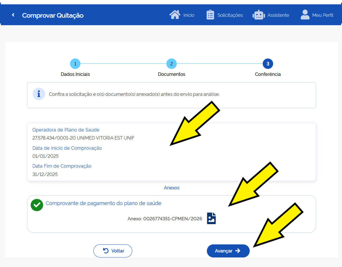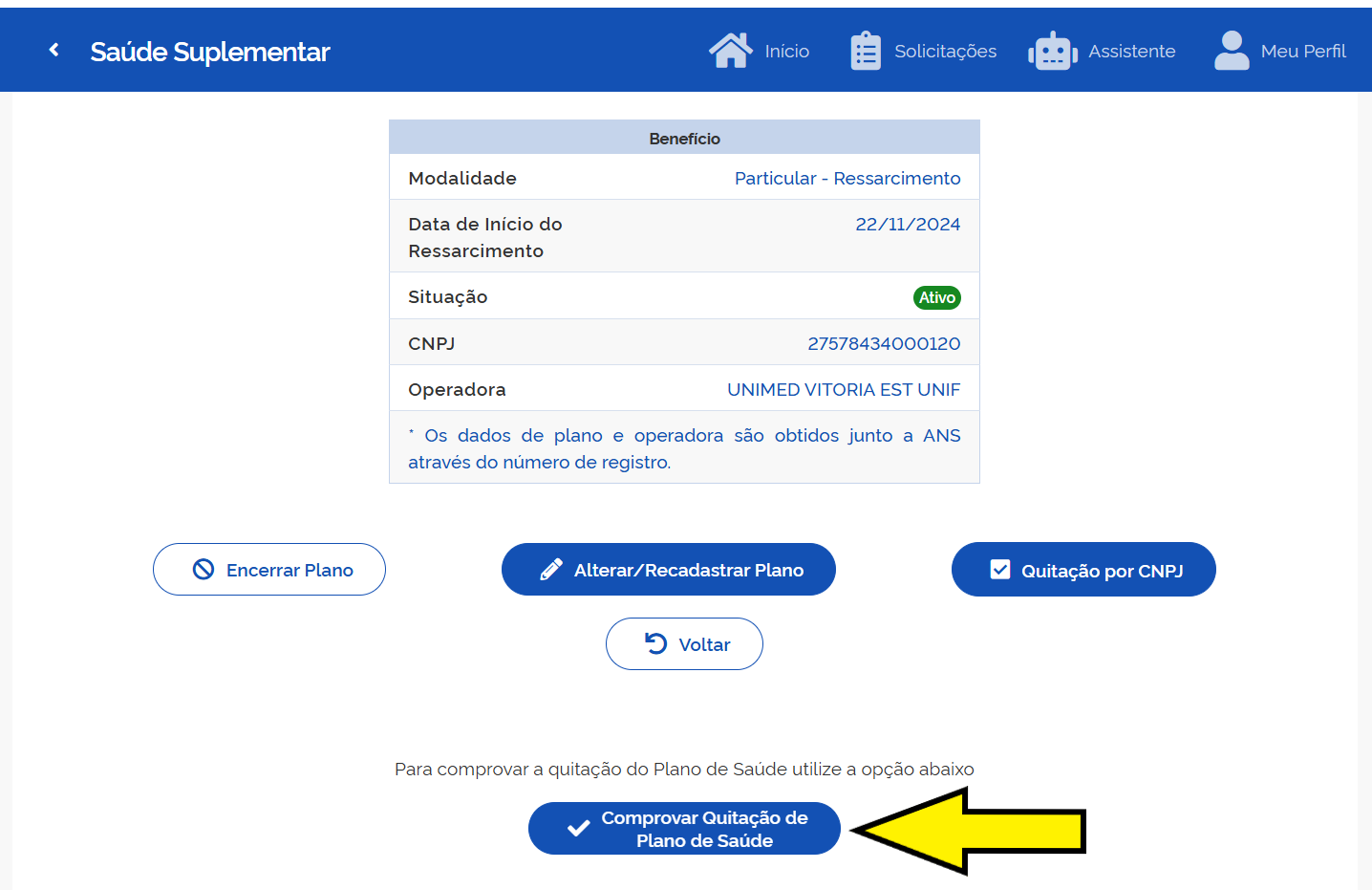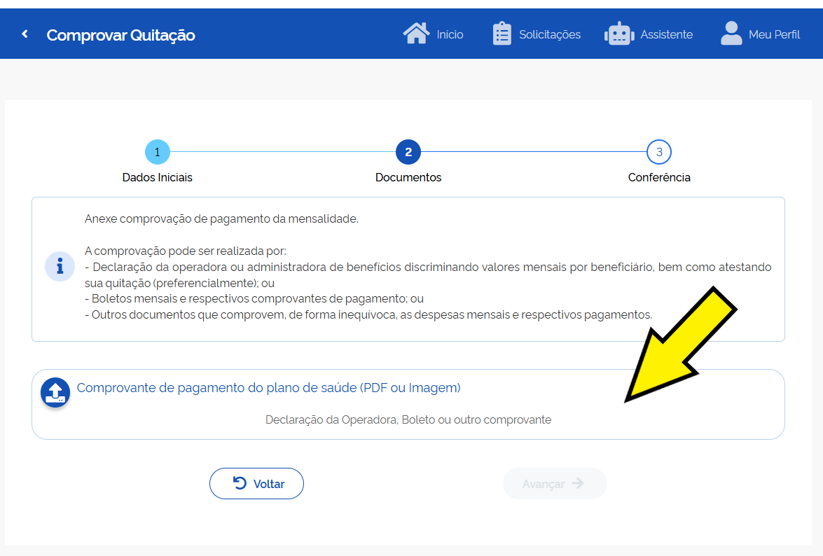 • Escolha "Comprovar Quitação de Plano de Saúde": Esta opção iniciará o processo de comprovação.