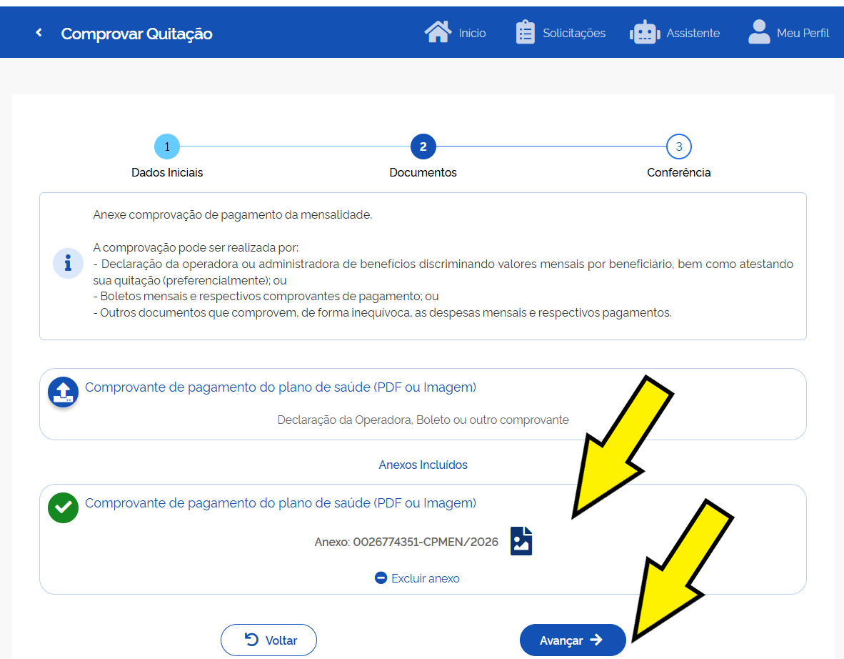 • Anexe os Documentos: Clique no ícone indicado para anexar os comprovantes de pagamento (declaração de quitação ou boletos e comprovantes de pagamento) em formato PDF ou imagem.
