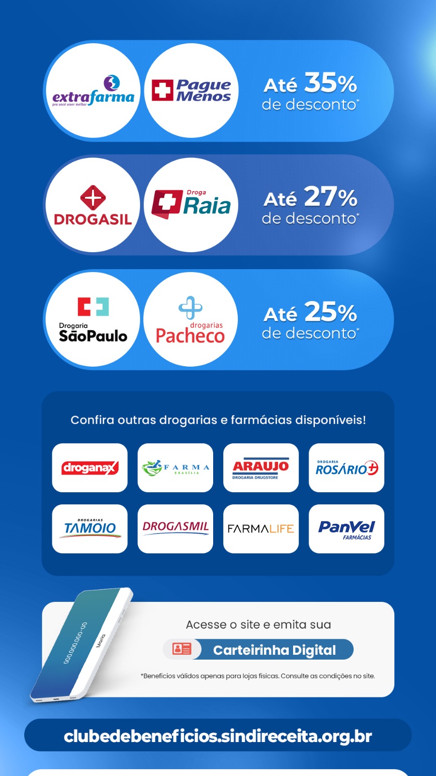 Nesta semana, o Clube de Benefícios oferece condições exclusivas nas principais redes de drogarias e farmácias do Brasil, com descontos em medicamentos, itens de higiene, cuidados pessoais e muito mais.