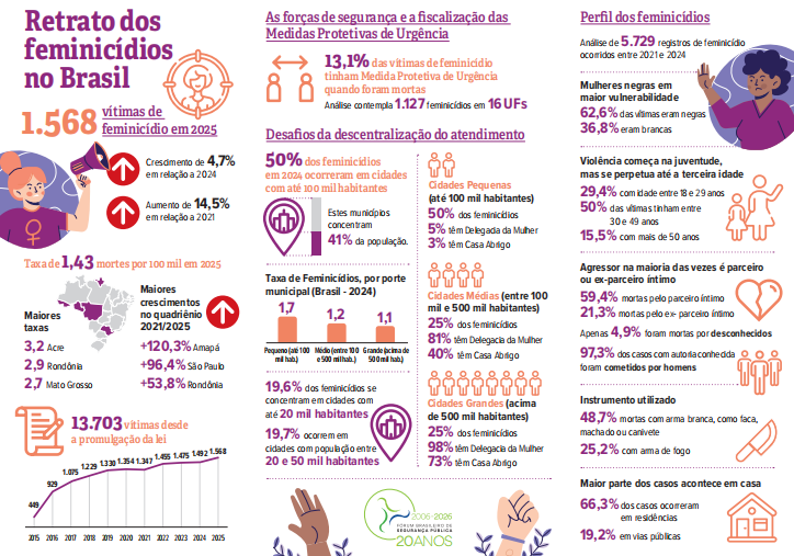 O Atlas da Violência 2025 destaca que a violência contra a mulher no Brasil é um fenômeno estrutural e persistente. A estagnação das taxas de homicídios femininos e o aumento da letalidade contra mulheres negras sugerem a insuficiência das estratégias atuais de enfrentamento.