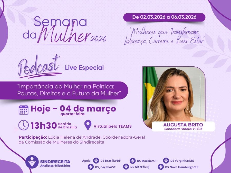 Colega filiada e filiado: não perca o episódio do Podcast do Sindireceita que será transmitido ao vivo nesta quarta-feira, dia 4, às 13h30 (horário de Brasília/DF), com o tema “Importância da Mulher na Política: Pautas, Direitos e o Futuro da Mulher”. O episódio integra a programação da Semana da Mulher 2026 e será conduzido pela vice-presidenta, Sílvia Felismino, com participação das diretoras Marlene Cambraia (Aposentados e Pensionistas), Ieda Miranda e Mariluce Vilela Fontoura; da coordenadora-geral da Comissão de Mulheres do Sindireceita, Lúcia Helena de Andrade; e da senadora Augusta Brito (PT-CE).