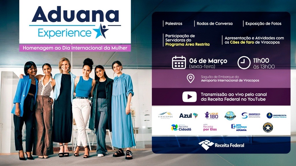 A Receita Federal realizará nesta sexta-feira, dia 6 de março, no Aeroporto Internacional de Viracopos (SP), o evento “Aduana Experience – Edição Especial Dia da Mulher”. A iniciativa marca uma edição especial dedicada ao Dia Internacional da Mulher e contará com a participação de servidores, parceiros institucionais e representantes da sociedade.