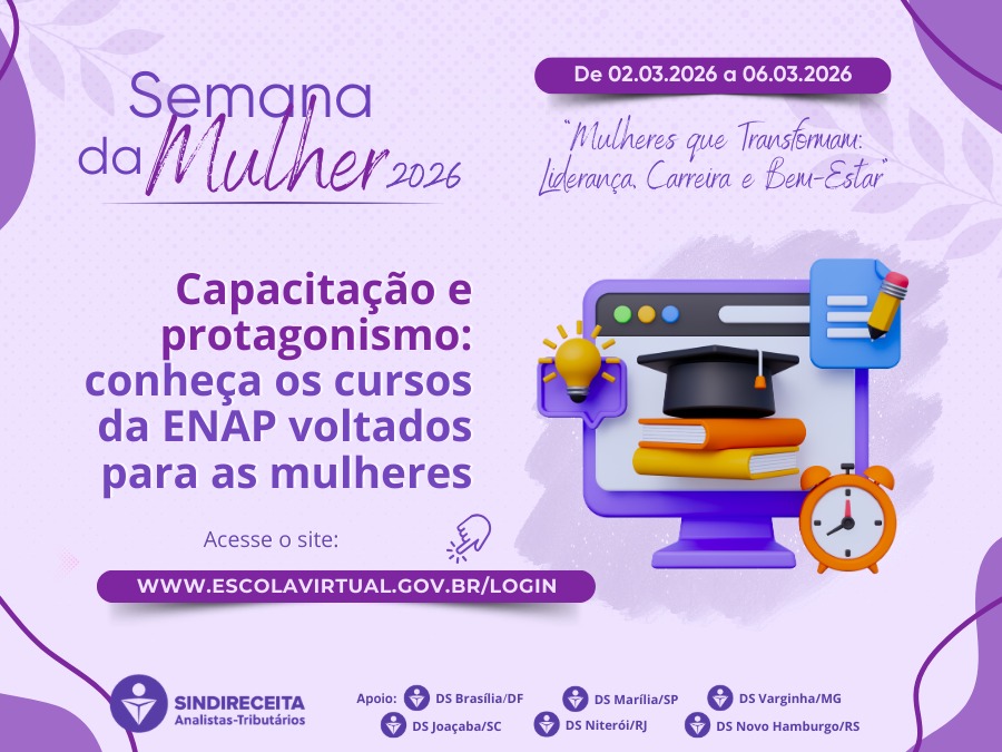 Como parte das atividades da Semana da Mulher 2026, o Sindireceita também destacou oportunidades de capacitação oferecidas pela Escola Nacional de Administração Pública (ENAP). Os cursos gratuitos, com certificação, abordam temas voltados ao fortalecimento do protagonismo feminino em diferentes áreas da gestão pública e da sociedade.
