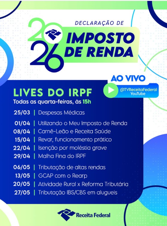 Ao todo, estão programadas 11 lives semanais. As transmissões ao vivo serão realizadas sempre às quartas-feiras, às 15h (horário de Brasília/DF), pelo canal oficial da TV Receita Federal no YouTube.