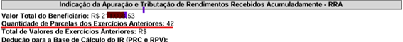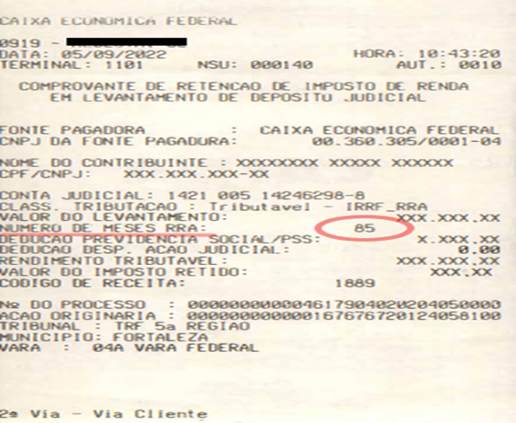 Ao consultar o extrato fornecido no ato do saque pela instituição bancária, observe que o campo referente ao número de meses da ação judicial costuma estar destacado. Essa informação é fundamental para o cálculo correto da tributação, se feito pela opção exclusivamente na fonte. Veja o exemplo abaixo:
