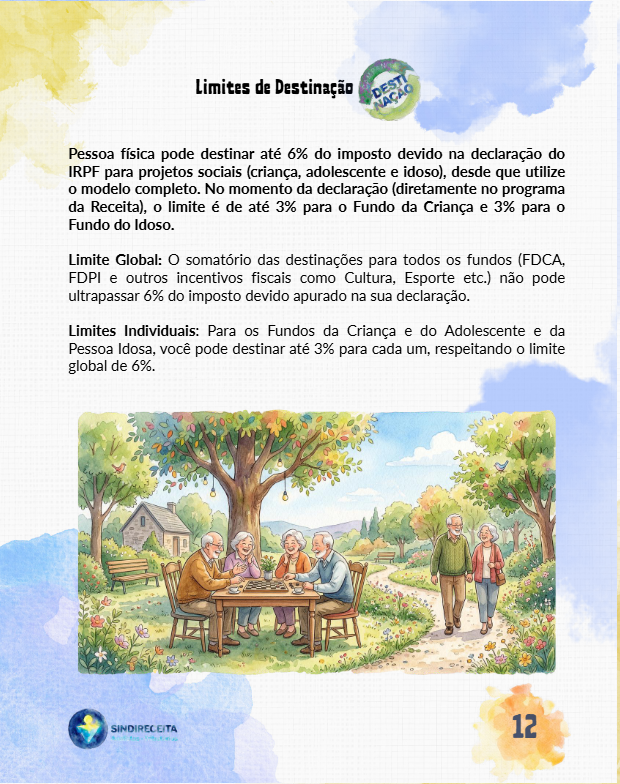 Os limites para destinação são de até 6% do imposto devido, sendo 3% para o FDCA e 3% para o FDPI, para aqueles que utilizam o modelo completo de declaração.